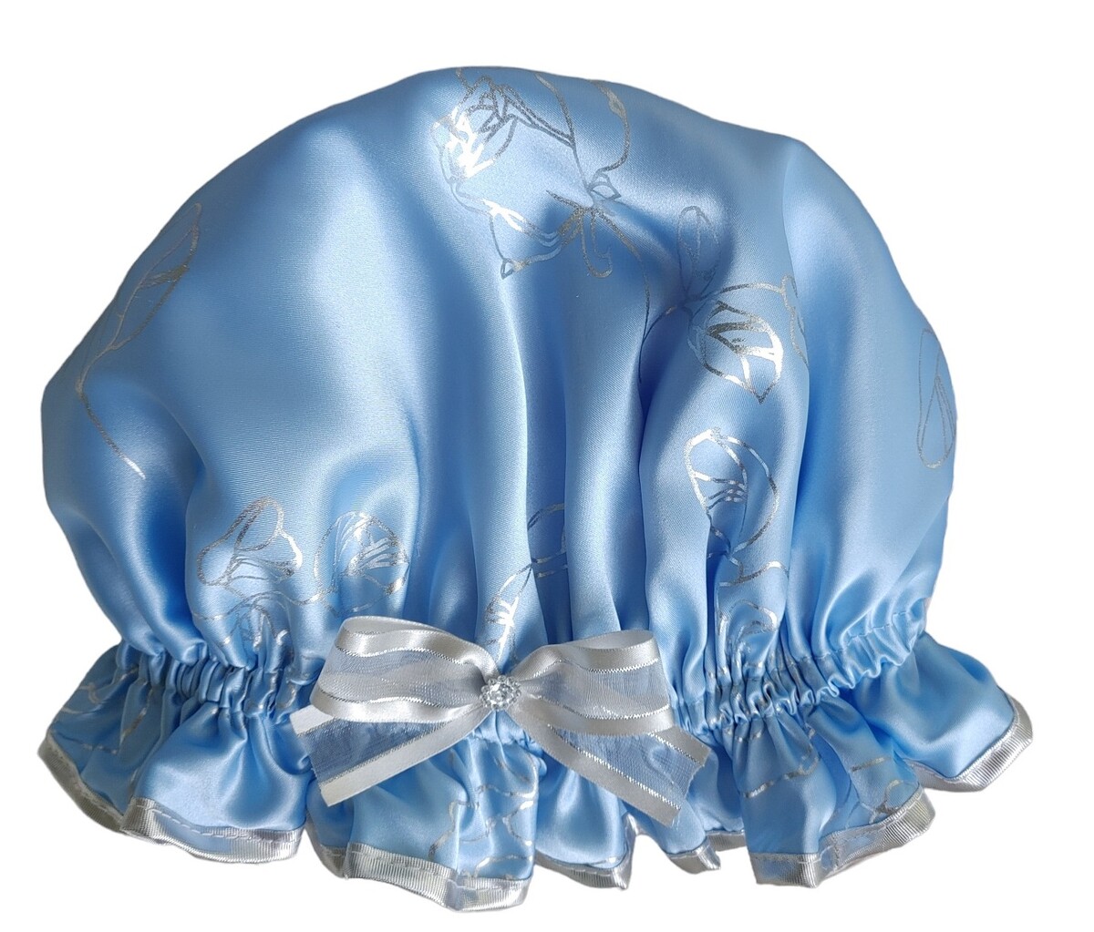 Welcome to the So Pretty Shower Caps Bloom range!  The Bloom - Sky fabric is a beautiful pastel shade of blue etched with Silver  Roses and would look charming as part of your bathroom decor.  The So Pretty Bloom - Sky shower cap is trimmed beautifully with a  matching Silver Satin Organza ribbon bow that is centred with a diamante for additional bling.