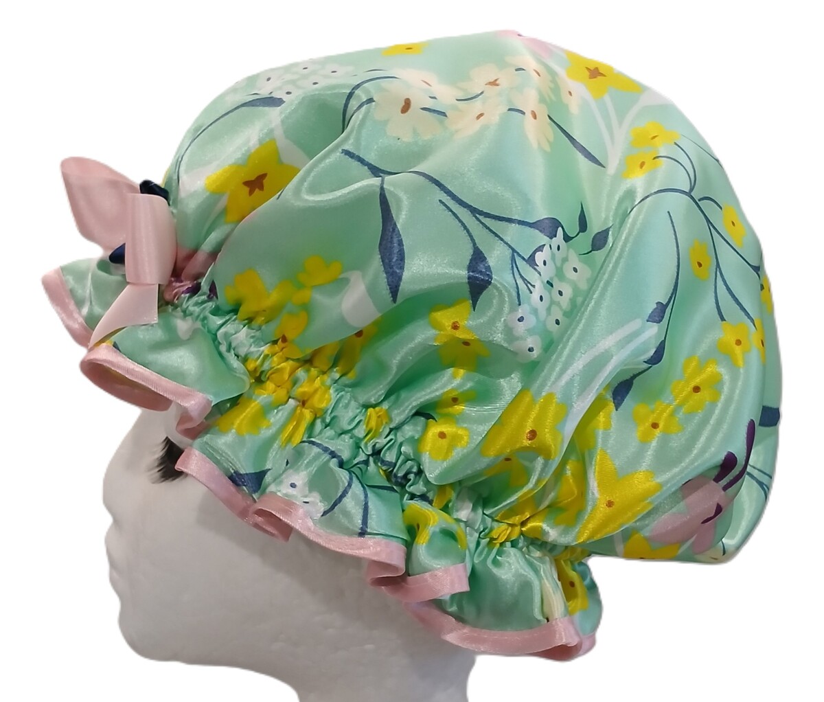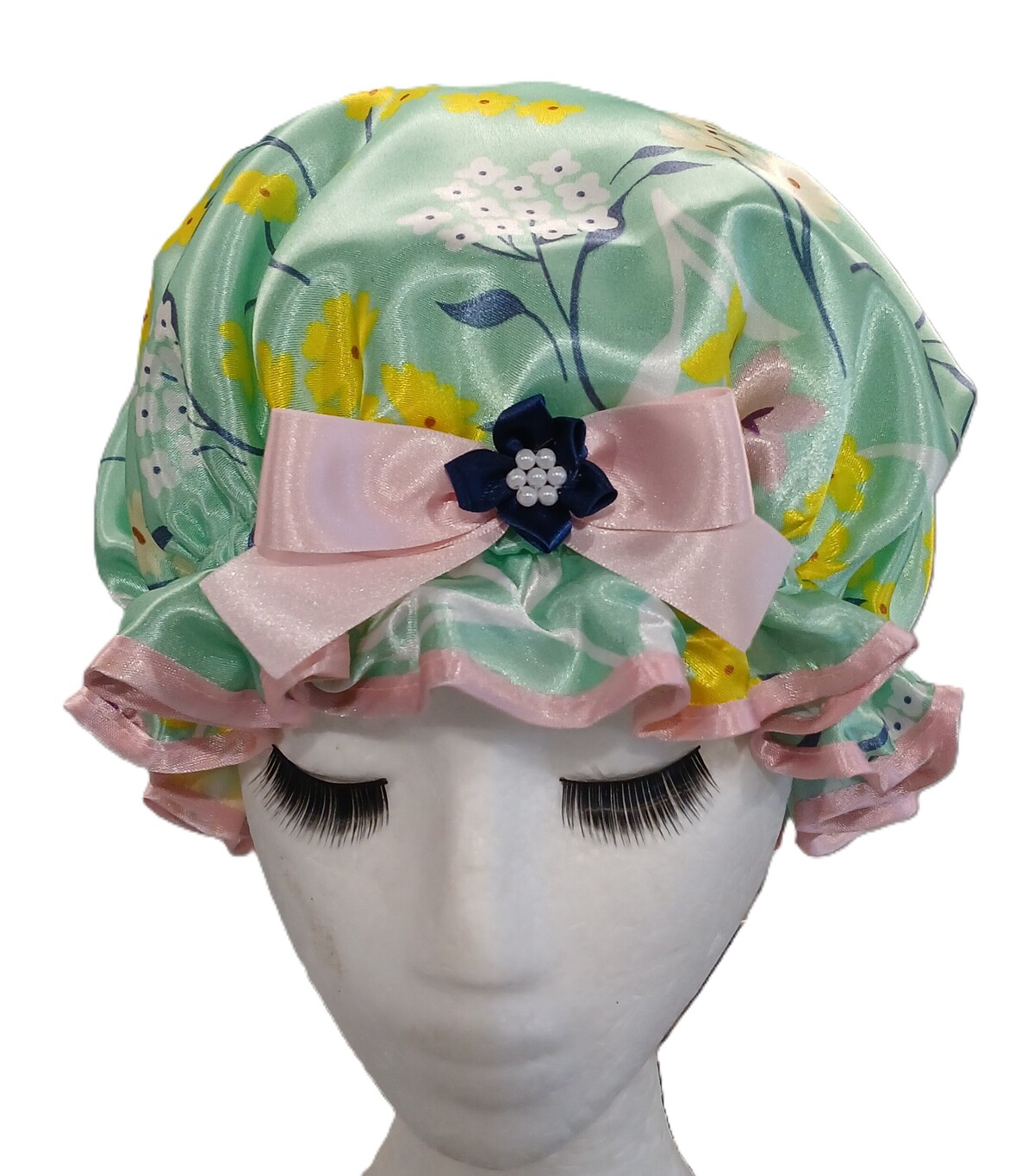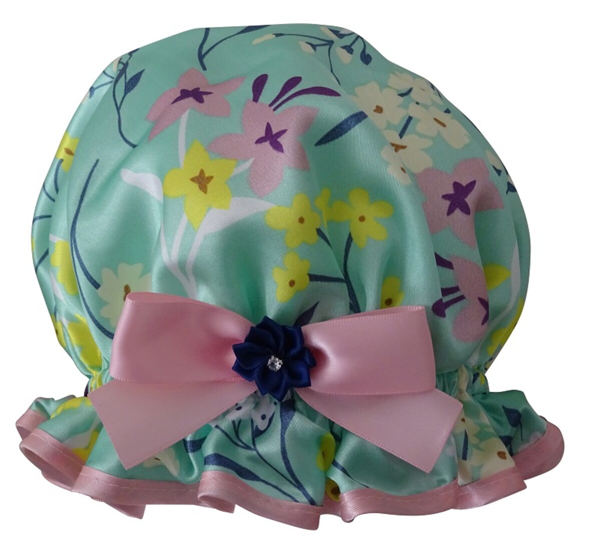 So Pretty Shower Caps has a delightful range of floral themed shower caps to choose from, talk about spoilt for choice in a nice way! This Blossom shower cap is another beautiful option to consider. The So Pretty Blossom shower cap is trimmed with a quality pastel pink satin edging and ribbon. Highlighted with a Navy Blue ribbon flower centred wit faux pearls. There is a pretty blend of pastels shades and a variety of flowers in this Satin print. Some of the flowers are similar looking to Cherry Blossom, so this shower cap could almost pass as being Japanese themed (kuwaii?) if you have this style of décor and love accessories that are especially pretty and girly. Kuwaii style is massive in Japan, even though this So Pretty shower cap is proudly handmade in Australia, we can still have something like a hair accessory that is cute and qualify for this description! Which is what the meaning of Kuwaii is, being the culture of cuteness in all things including clothing, accessories, entertainment and the look you personally have or way you present yourself. Even though it is common and accepted in Japan to become for Kuwaii style to be a part of your lifestyle, here in Australia it is more of a novelty. But a cute Blossom shower cap would definitely qualify as a Kuwaii item and look just as cute covering your tresses! Perhaps if you have a friend or relative living in Japan this So Pretty shower cap would be a well received gift from Australia!