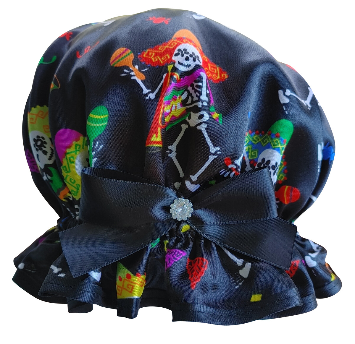 The concept of the Sugar Skull is to honor the return of a departed spirit. Hence the Calavera is decorated in folk art style and is very glittery and colourful! Much the same with this So Pretty shower cap, it is a fun accessory and would put a smile on your face. Calavera even has a touch of glamour with a diamante centred on the ribbon bow, simple but effective!