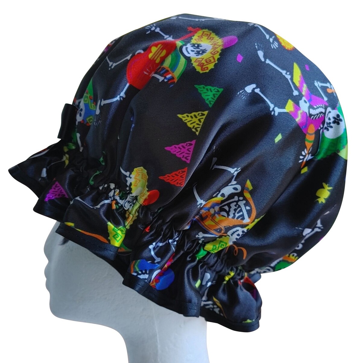 Calavera is not only a quirky So Pretty Ladies Shower Cap with dancing skeletons, but it has a meaning too! Calavera means Sugar Skull, and this Satin print actually is themed for the Day of the Dead celebrations that has its origins over 3000 years ago in Mexico. These skeletons are real party animals with a collection of musical instruments and bright sombreros! This shower cap may appeal to someone with an alternative fashion style, or who loves quirky accessories. If they use a shower cap, then this is an ideal choice! Even if they don’t, they soon will once they see this design! Just a slight upgrade from flimsy disposables is it not?!
