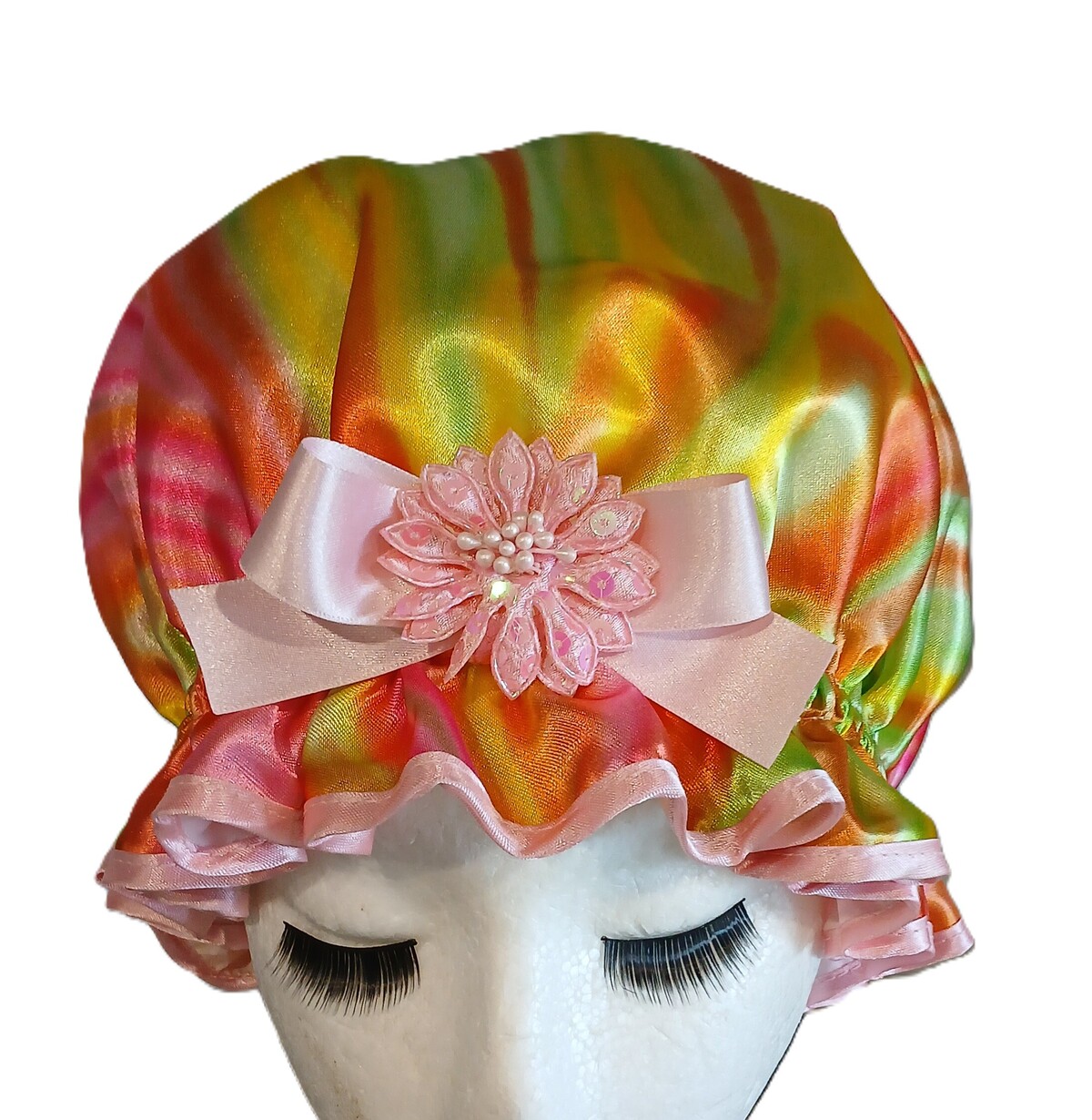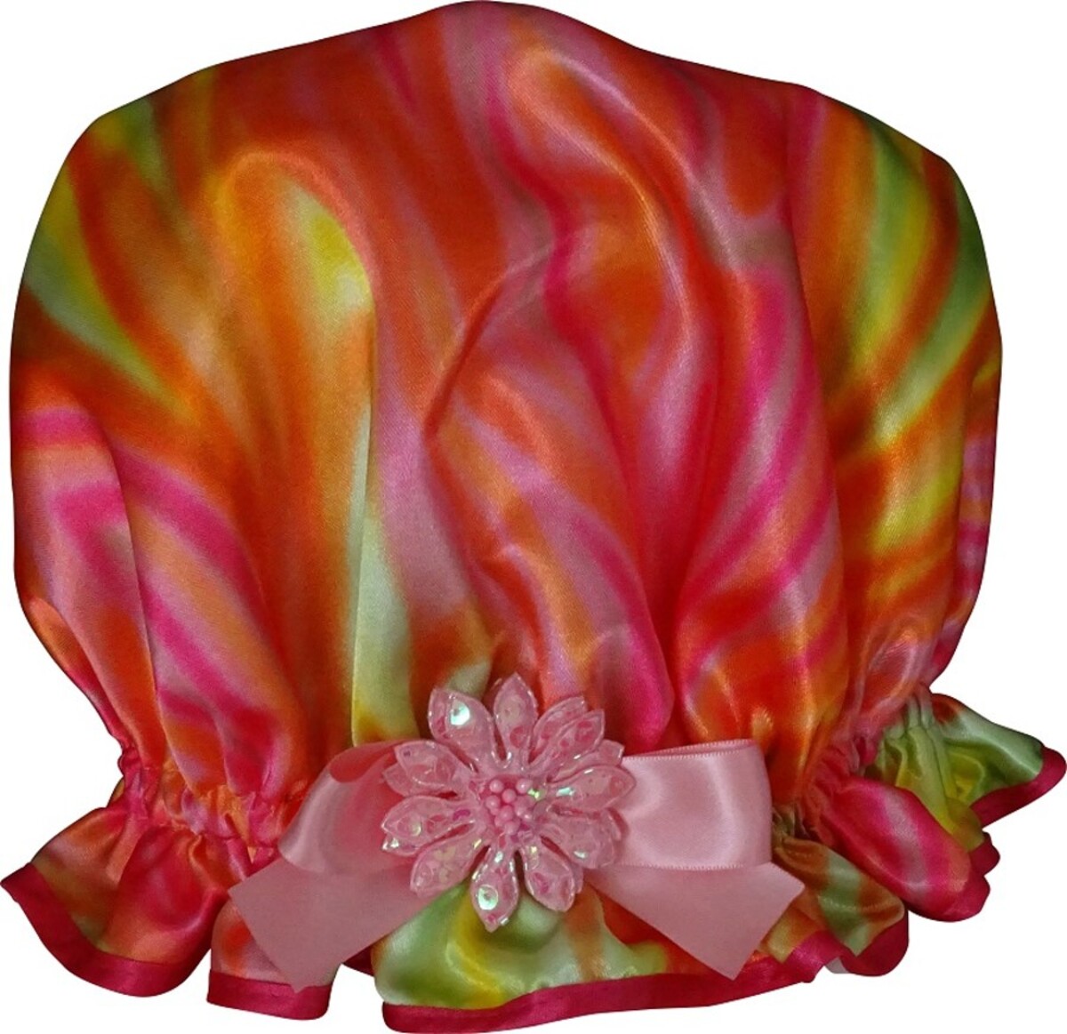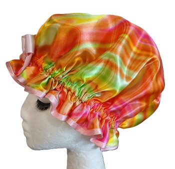 What a blast of colour this So Pretty Shower Cap is! If you are a morning shower person, a vibrant hair accessory like the Carnivale will be a bright start to your day. This So Pretty Shower Cap is a gorgeous Satin print of swirling Hot Pink, Orange and Lime and is sure to be a favourite with the flamboyant ladies and teenagers out there. The oversized sequinned flower trim adds some glamour to the finished product as well. The concept of Carnivale as a description creates an image of colour and fun, along with celebrations and partying. The Carnivale shower cap definitely is colourful, a fun hair accessory to have and to use. Whether you use it to wear at a party is up to you but it would qualify very well for a "crazy hat" party at the very least! Since the main purpose of a shower cap is to keep your hair protected and dry, the applications aren’t just limited to shower time. They have been known to be used during water aerobics classes (note they are not bathing caps as such), keen golfers who play in the rain, outdoor spectator sports (think team colours as a shower cap option!). Whatever you dare to do in public wearing a shower cap really. No matter what the scenario is, the So Pretty Carnivale shower cap will reliably keep your tresses up and away, protected from the elements. You will be happier and your hair will love you for it!