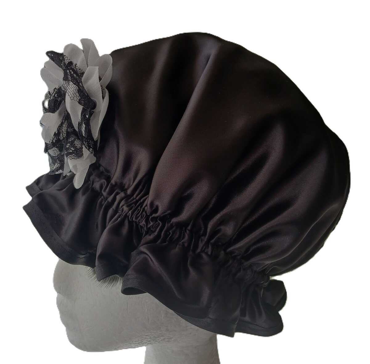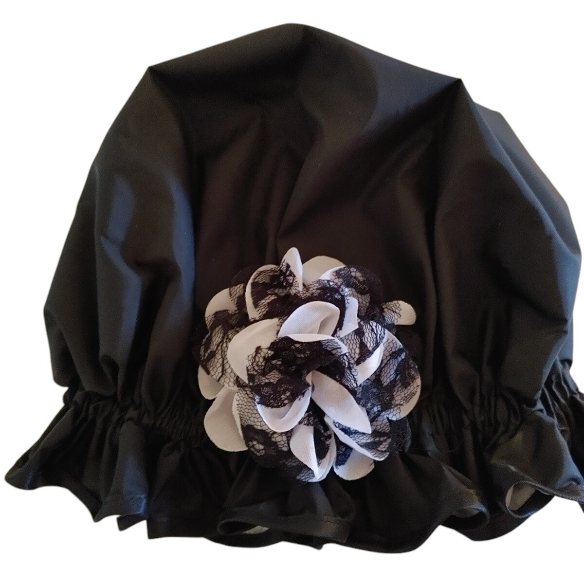 Did you know that Black and White are the most popular colours used in Fashion? It makes sense really, a base colour to match everything in the world around us. The So Pretty Classic Black shower cap in the Flower range is simple yet elegant and would add a touch of finesse to your bathroom. The Classic Black Flower is made to the high standard of quality you would expect from So Pretty, who has been creating shower caps since 2002. The Flower range was introduced as there are Ladies who do not like a lot of bling on their shower caps, just a simple and understated look is fine. So the Flower range was established and has been very popular too! This So Pretty Shower Cap has a lovely matching flower in a combination of Black silky fabric and Tulle. The petals have a mix of Dusty Rose and Burgundy shades mixed with Black and a touch of Sage. The shower cap itself is trimmed with Satin edging. Overall a "so pretty" shower cap you would be proud to be seen using if caught in the shower! So Pretty shower caps can also be used to keep your hair up and out of the way whilst applying makeup, or having some pamper time with a facial or face mask that needs to stay on your face for a while. It is easier to still do things around the house then whilst you are wearing your So Pretty shower cap and your tresses are out of the way. Would you answer the door though with a green face but wearing a So Pretty shower cap? This is one of lifes big questions and a dilemma that can confront you, with this perfect timing (not!).