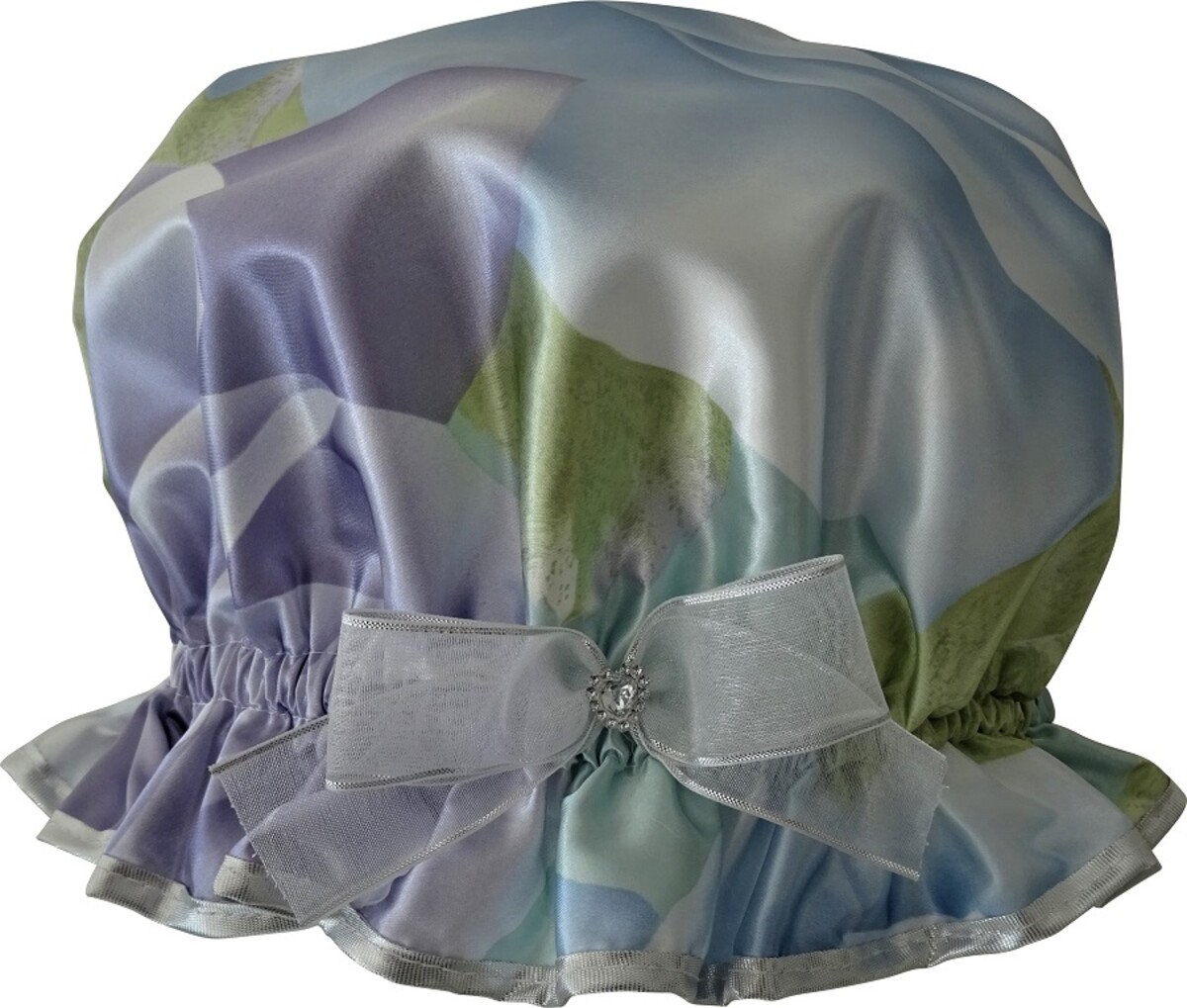 The Classique shower cap is complimented with Silver Lame edging and a matching Silver edged White Organza ribbon bow. This is centred with a dainty diamante charm. This is one shower cap style that would be very impressive as a gift (for the mother in law?!!) or for a lady who appreciates style and elegance. The pastel shades and silver highlights make the Classique a hair accessory to be noticed and a feature in your bathroom!
