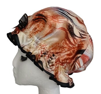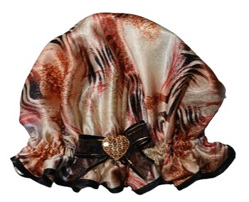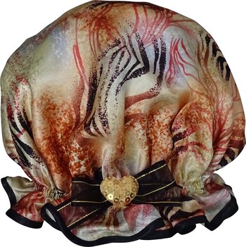 The Coral Frenzy shower cap is a marine themed satin print of swirls and a design looking much like coral flowing through. Colours include earthy tones of cream, orange/apricot, ochre and dark brown/black. The Coral Frenzy is edged with black satin and embellished with an organza ribbon bow a larger gold sequinned heart.
