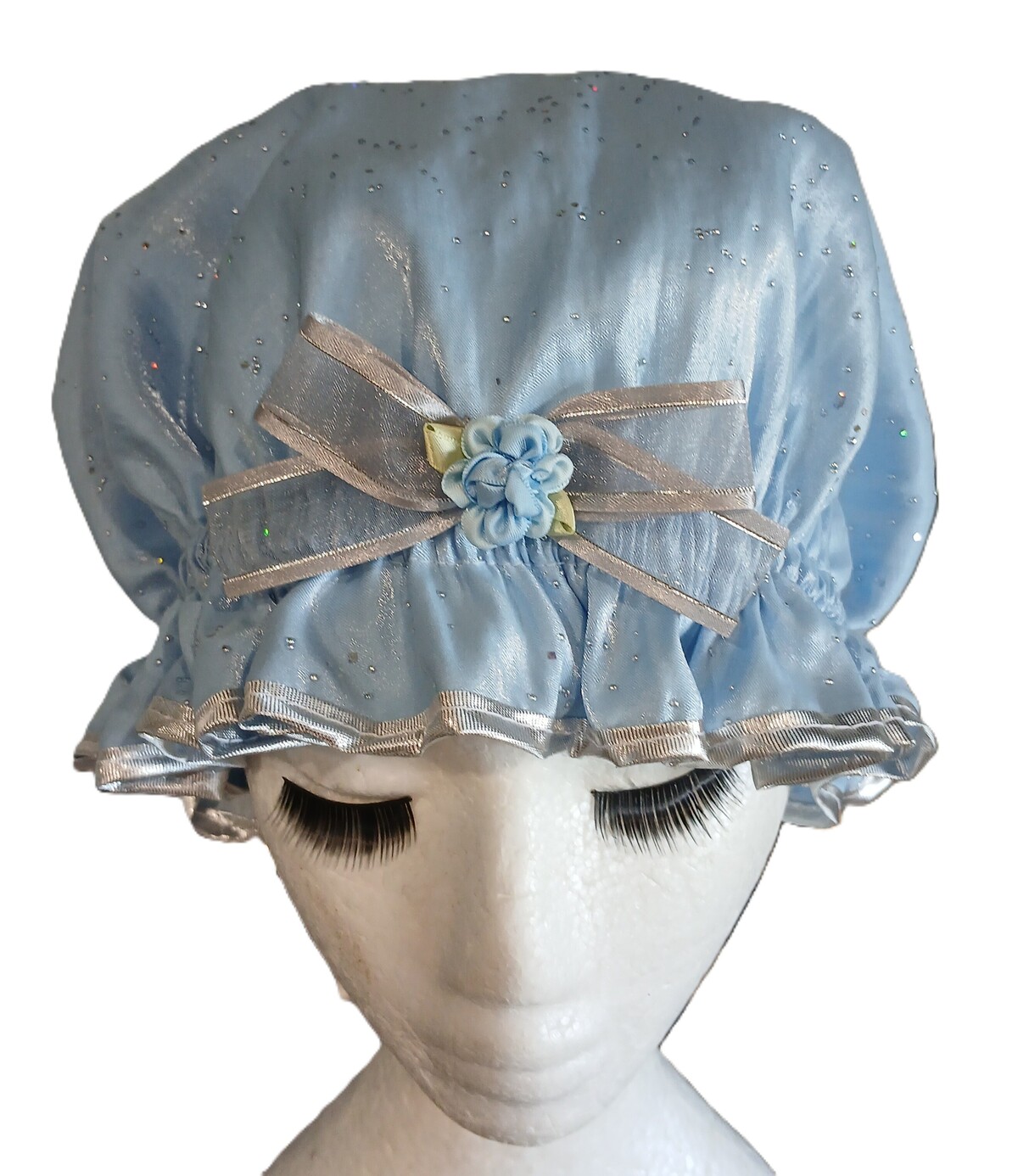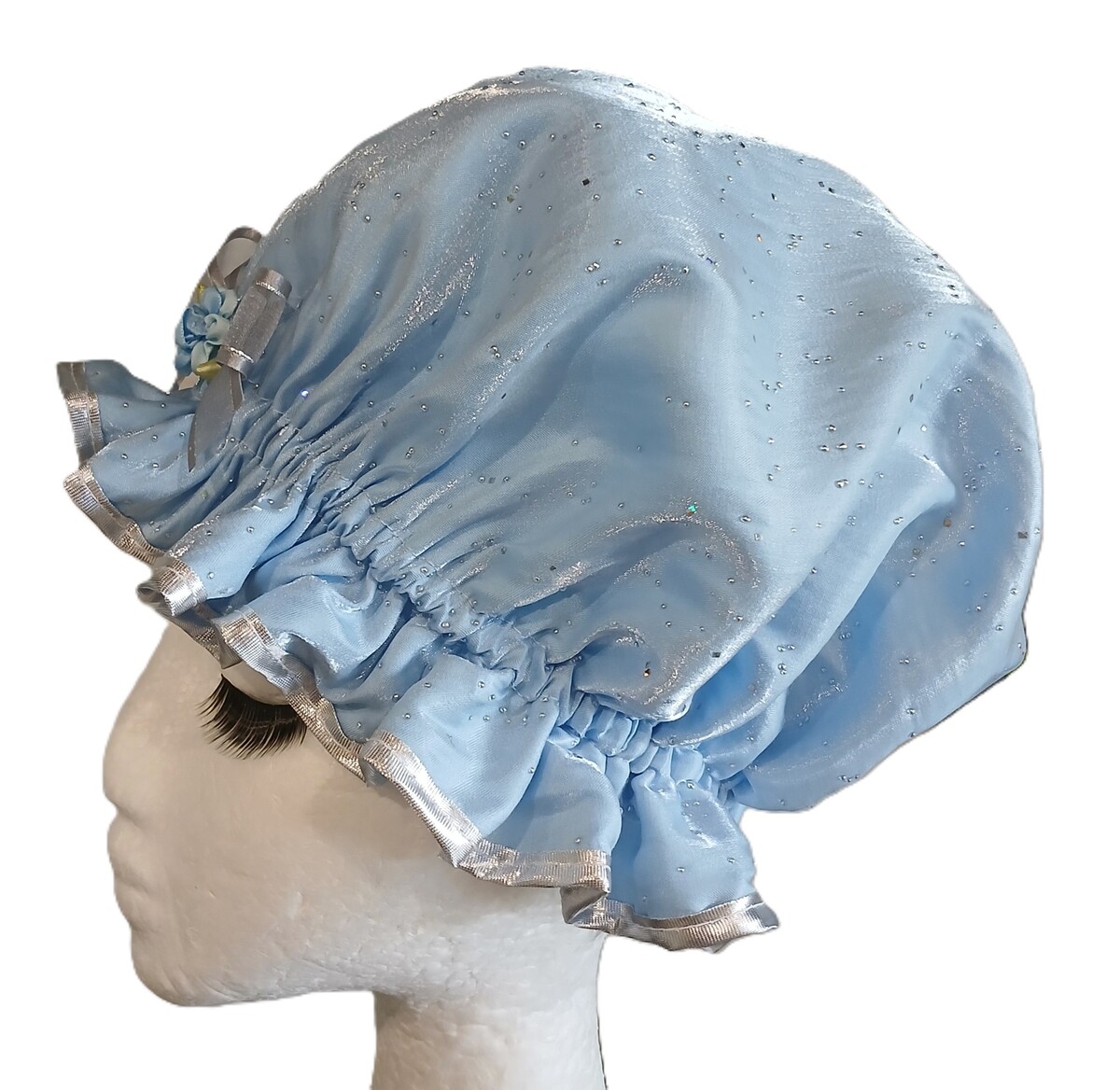 This ladies Crystallina Blue shower cap is a soft pastel blue fabric that is scattered with crystal like chips for added sparkle at shower time!  The satin organza ribbon used here is decorated with a perfectly matching flower embellishment for a fabulous finishing touch.