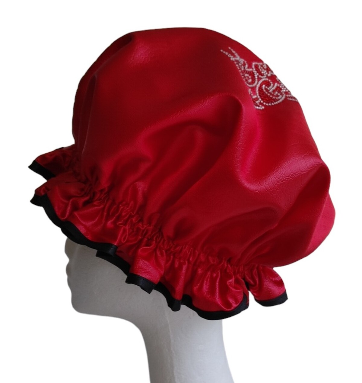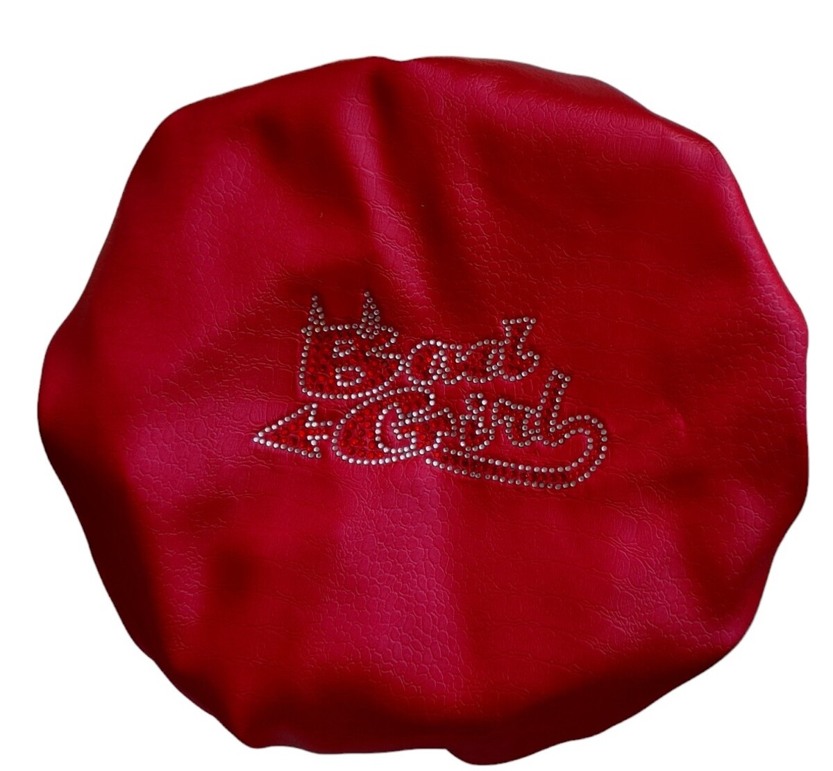 The So Pretty Bad Girl Red Diamante shower cap is constructed using a high quality fabric with a fine textured finish giving a leather look. The colour is a deeper shade of red, even closer to being Burgundy (which is isn't)!. This is a So Pretty shower cap that would be a wonderful gift idea for a special occasion, be it Valentines Day, Birthday or Christmas (this is a hint for guys especially for a sexy gift idea!).