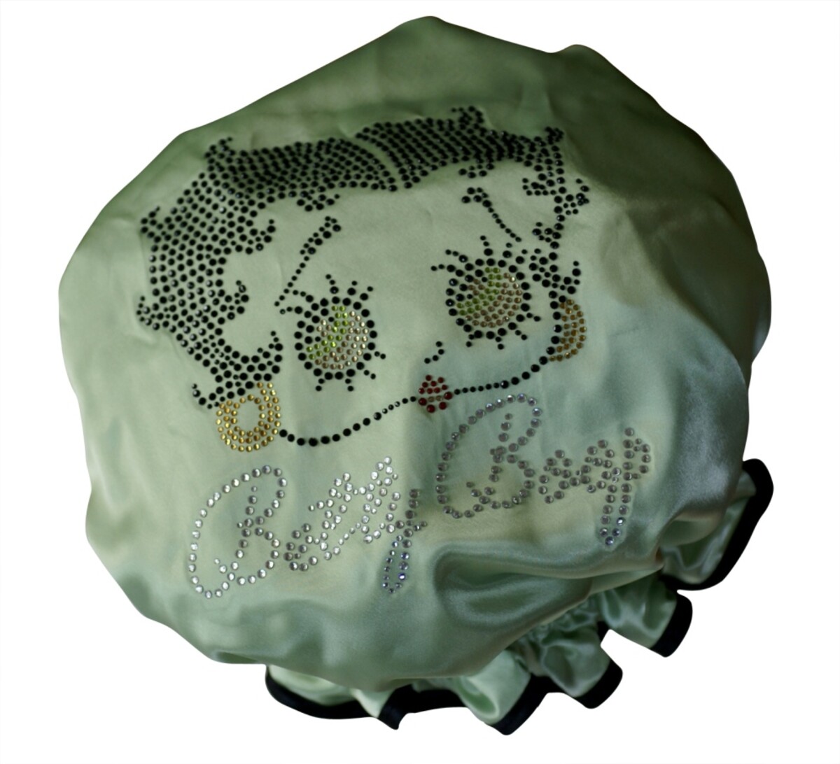 A cute Betty Boop shower cap for all the fans out there! This So Pretty Betty Boop shower cap uses a soft Charmeuse Satin in a pastel Lime colour, and is also available in Shiraz Red.