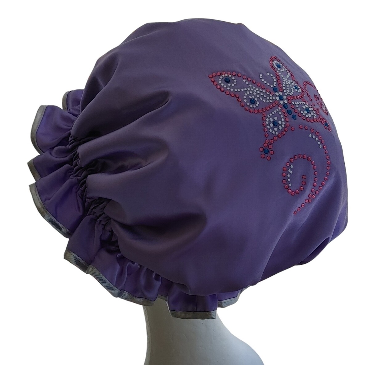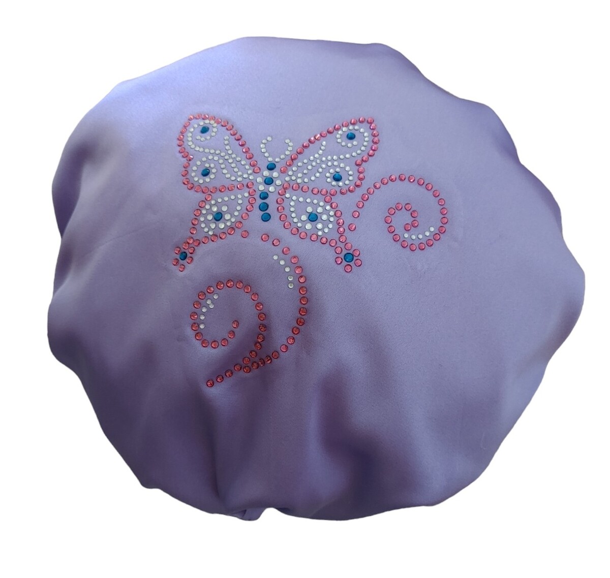 Here is a delightful Satin Ladies shower cap created just for the Butterfly lovers out there! A large sparkling Diamante Butterfly decorates this So Pretty shower cap, created using colours of Dusty Pink, Silver and dark Aqua.