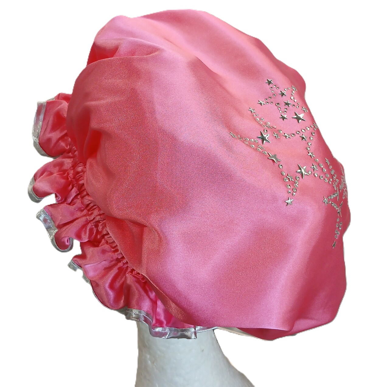 A heavenly Diamante Stars So Pretty shower cap to add some sparkle to your bathroom! Available in Hot Pink and Lilac options, this diamante design would especially appeal to the "singing in the shower" kind of girl or the bright star of the family! This So Pretty shower cap is made using Charmeuse satin and edged with Silver Lame trim. A Star is born, or created in this instance by So Pretty. We are fascinated with stars of all kinds, even the ones on this shower cap can represent heavenly stars or Hollywood stars of big screen! Whichever is your preference is fine by me! Be a Star singing in the shower with this So Pretty Diamante Shower Cap! And like the star on the front door of a change room for the Star of a show, this So Pretty Shower Cap can adorn your bathroom so everyone knows whose shower cap it is! Ah, then there are the stars that we live by, Star Signs…now that is a whole different realm of stars. Still, fun to stare up into the heavens and try to figure out the location of certain configurations, and read your horoscope for guidance in your life. If you’re like me, in Australia all we can find is the Saucepan and Southern Cross (don’t ask me for help if we are lost in the outback!) So this shower cap has a variety of suitable owners that the Stars design may be more appropriate for – the Movie Star persona, Galaxy Star lover or a Horoscope follower! Of course this isnt a requirement, just a suggestion if you are stuck for gift ideas for someone! There is a suitable shower cap for any style or personality here at So Pretty Shower Caps!