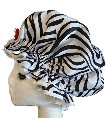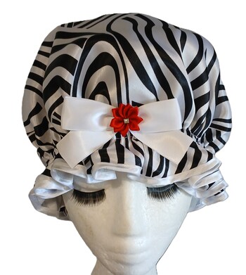 Here is a So Pretty shower cap that would suit any bathroom as well as being perfect for your hair! An abstract Satin print in Black and White, it has a modern look and feel to it. The red ribbon flower trim adds just a touch of colour to glam it up even more. When you think of the word Dynasty, family comes to mind. Which leads to the question of if you use a shower cap, is it because your mother did? So Pretty has been around since 2002 and ever since the original days of selling at craft fairs, conversations about shower caps and who uses a shower cap were often had. Some ladies never use one (but can be converted of course!). The ones that do use a shower cap. it seems to be a product that has been around in the family bathroom all their lives. So almost like a Mother/Daughter tradition, ladies have a shower cap as a familiar bathroom accessory in their homes. The major difference these days is that now the range of much more beautiful and quality shower caps are available like the ones here at So Pretty! Then they are made to last and you never have to put up with cheap and nasty excuses for a shower cap any more. So this shower cap design is called Dynasty, in honour of the generations of shower cap users and to passing it on...and now So Pretty also has a Mens shower cap in Dynasty available. This will save them sneakily using their partners shower cap as they can now have their for own use, 9and possibly matching) So Pretty Dynasty shower cap