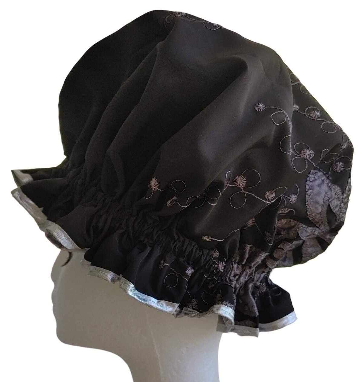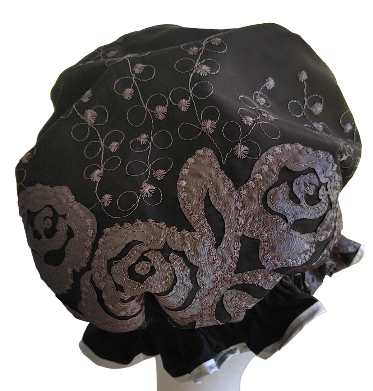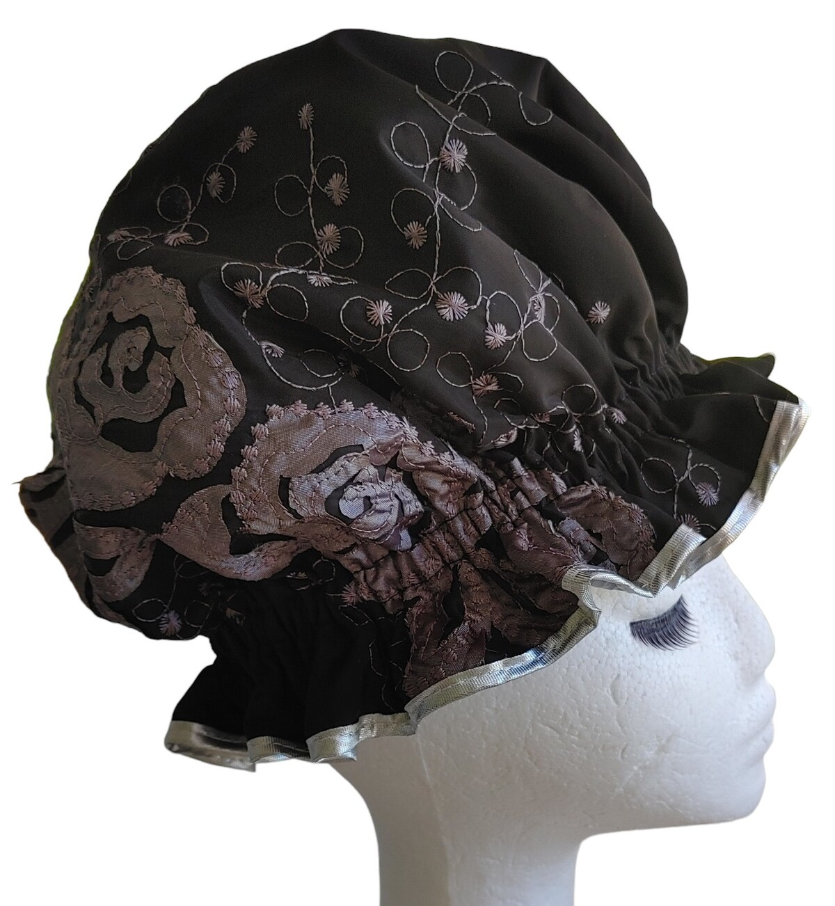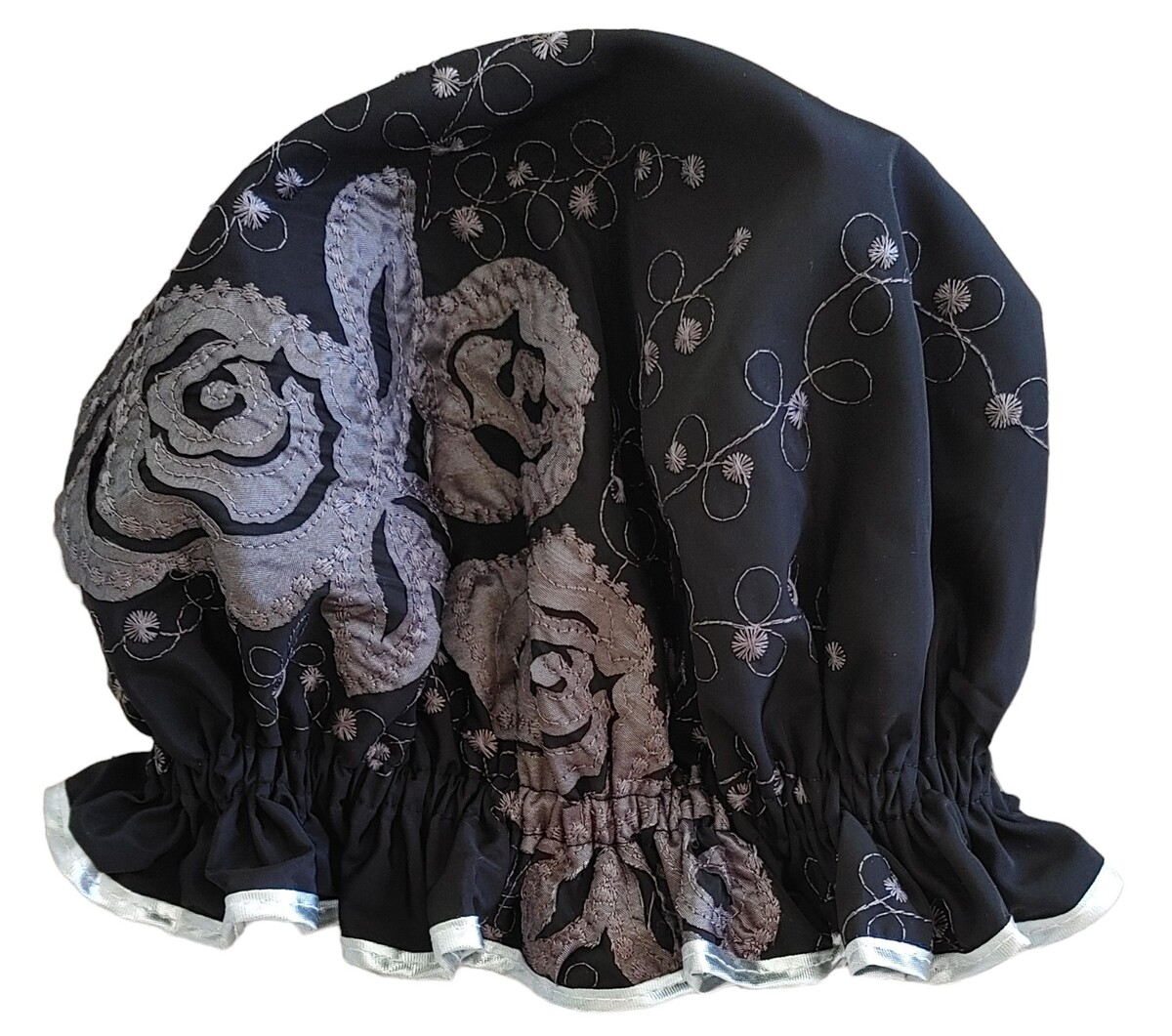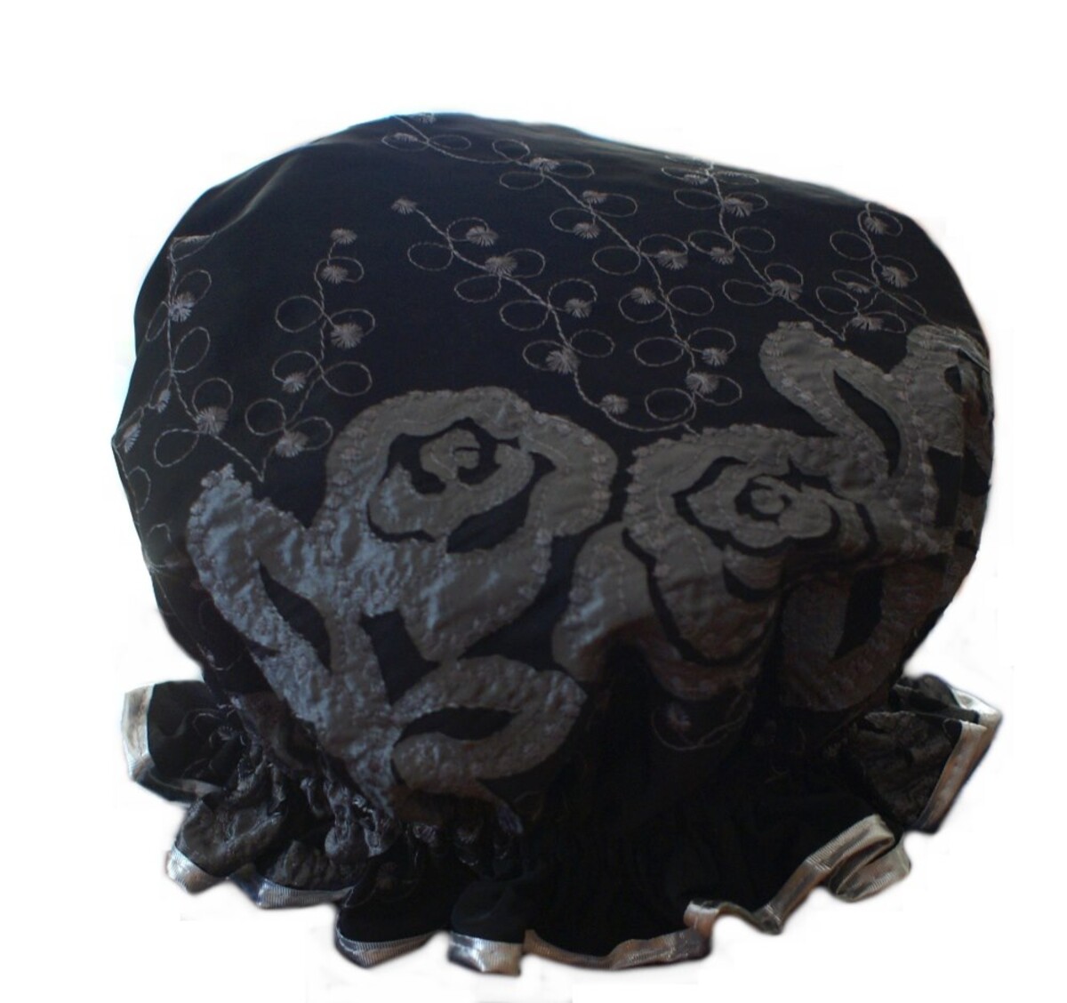 The point of difference with the Elegance Flower Power are the flowers on the design. They are similar to applique work, in a solid grey colour. Then there are delicate tendrils like Snow Pea loops leading off the flowers across the shower cap. This is a design that does not completely cover the shower cap, what you see is the full pattern but there isnt much left plain in any case. The Elegance Flower Power shower cap is finished of with Silver Lame trim.