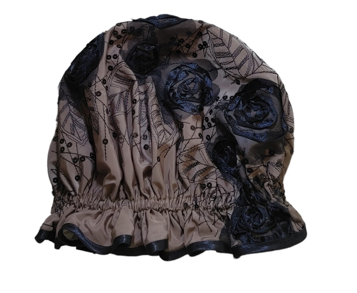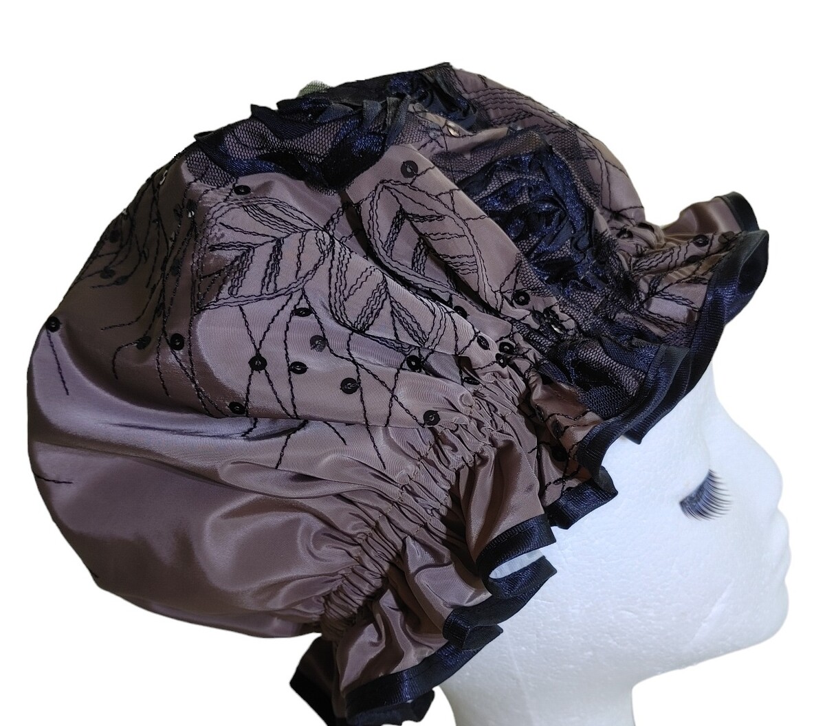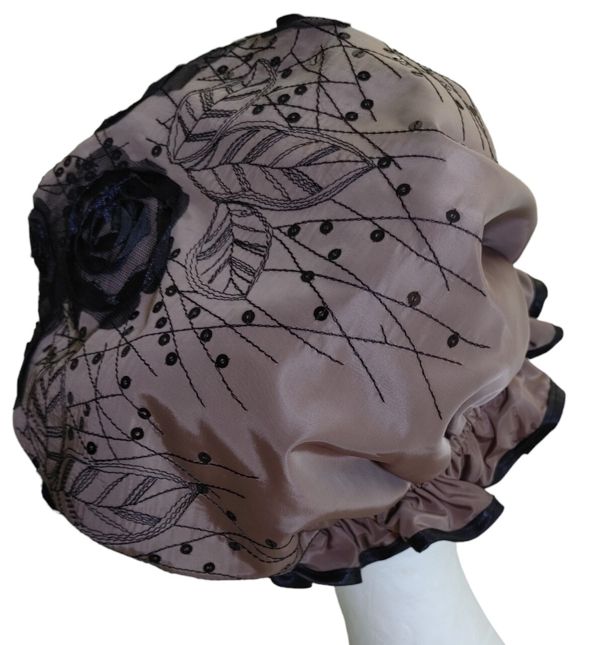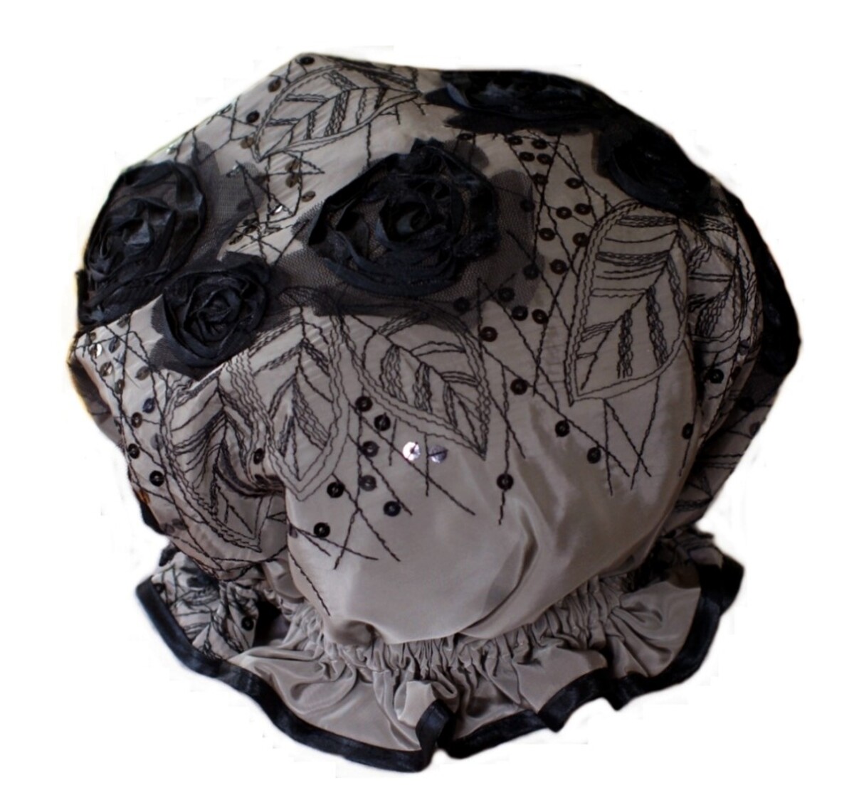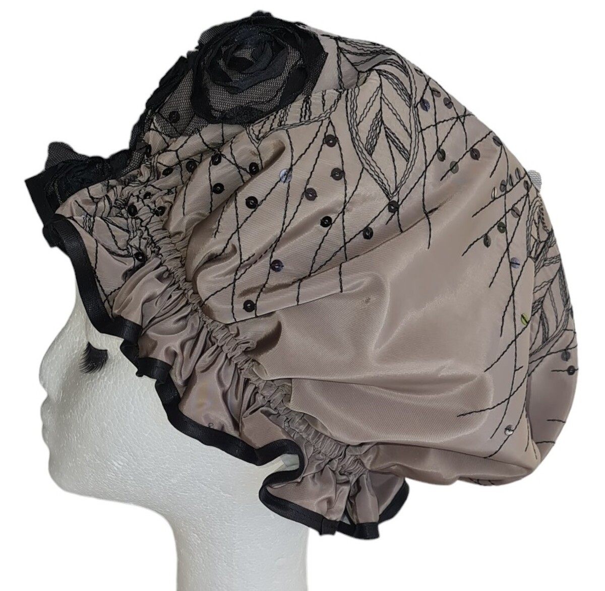 This So Pretty shower cap is named Elegance - Roses as it has beautiful roses ON the shower cap, not a print. The rest of the shower cap fabric is partially covered with embroidered leaves and additional Black sequins throughout the pattern. This embroidery and the roses cover most of the shower cap. So no ribbons and bows, just a perfect shower cap that is generous in sizing and still sewn to perfection!. The fabric is one of my favourites for a shower cap being somewhat similar to a Taffeta. As a result it is lightweight, does not crush and dries quickly.