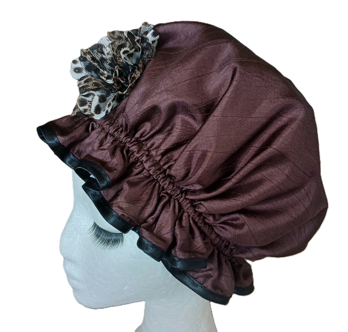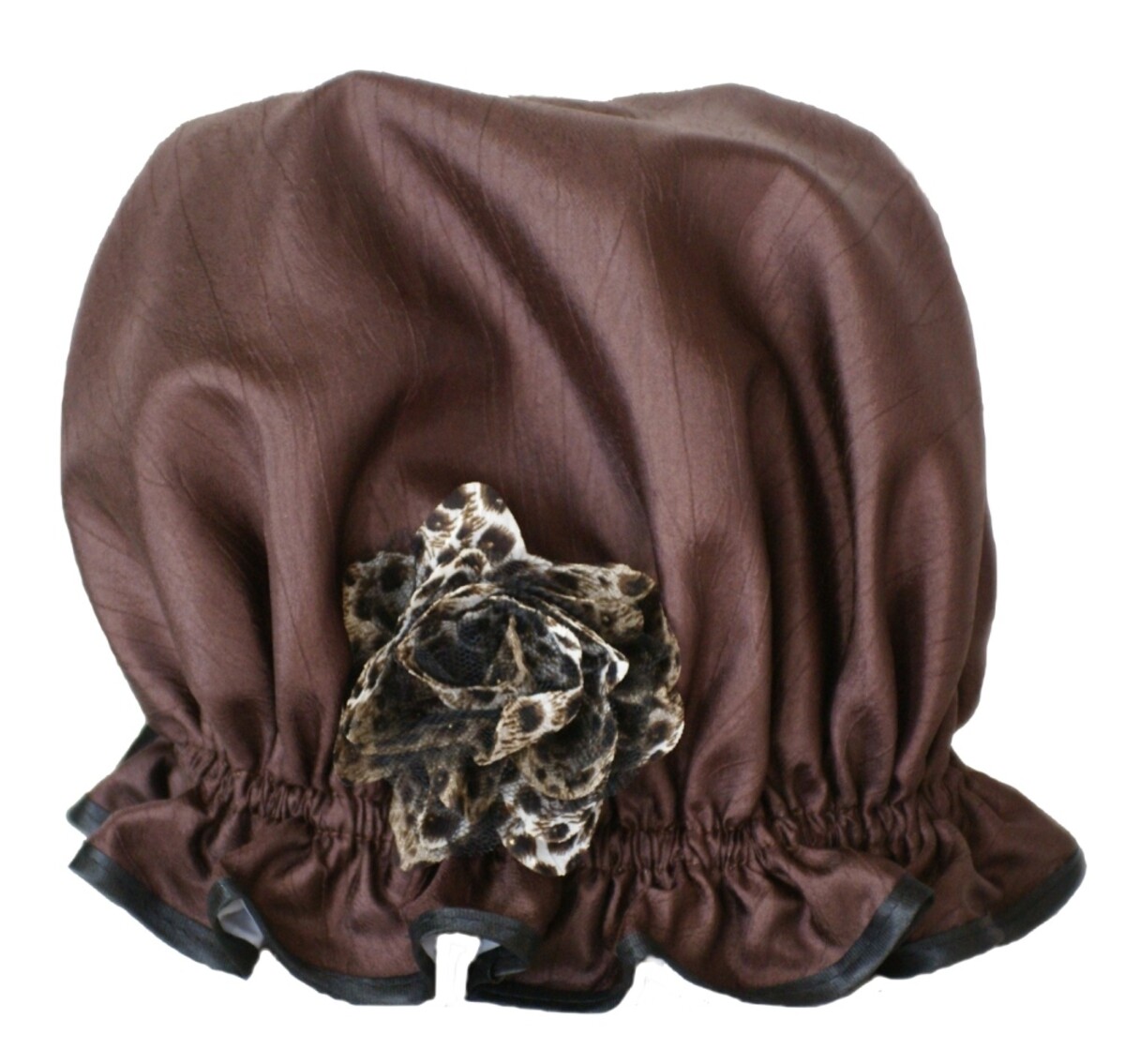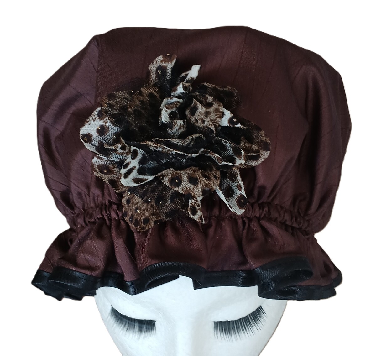 Expresso – Flower is an alternative to the usual frilled edge Ladies So Pretty Shower Cap design, having a flower embellishment as the point of difference. There is a similar Ladies shower cap using the same fabric with the Satin ribbon carnation flower and Black Satin edging. If you love this colour then there is an executive decision to be made, or choose both! This is a sure fire way to get your Coffee fix in an alternative form! The Expresso shower cap is created using chocolate Brown Crushed Taffeta with a flower in Leopard print fabric. Combined with the Leopard Print fabric is Black Tulle which is an attractive addition. There is also a little bit of sparkle within the flower to add a touch of glamour to the Expresso! Hence this So Pretty Shower Cap may appeal to ladies looking for something a little more toned down but still have style! Also for Ladies who love the classic style of dark browns. So Pretty has a fabulous range of shower caps, too difficult to choose just one but it is fun deciding! Selections can depend on personal preferences colour wise, or looking to match the bathroom décor at the very least. Any So Pretty shower cap will suffice as they are all meticulously made and will serve you well. But finding the one that says "that’s me!" is the joy of shopping here at So Pretty! Then you start thinking of others who may love a So Pretty shower cap, and what style they would like. So the hunt is on to match colours and styles with personality and bathroom decors! You will achieve a long wish list to be sure, but it is a pleasure to create one of shower caps that are short listed to be the special one that lands in your bathroom and is loved!