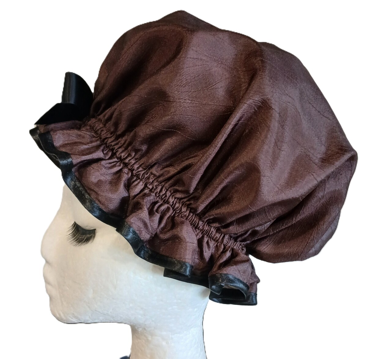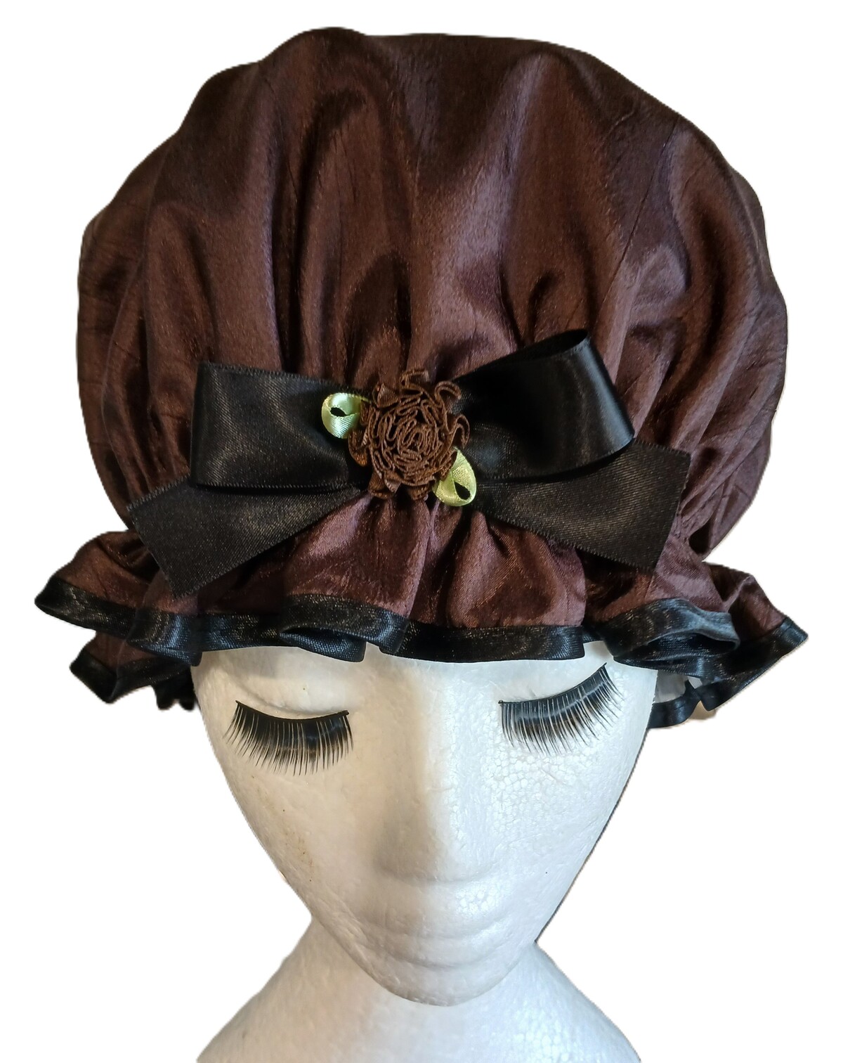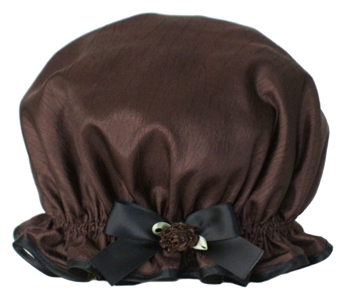 Expresso by So Pretty Shower Caps is aptly named for its dark brown fabric of which the colour is relatable to coffee. That is how my mind worked whilst thinking of a name for this So Pretty design anyway! There are millions of coffee lovers out there, so here is a shower cap especially for you! Some people cannot function without their coffee fix, perhaps the same can be said about a decent Shower Cap. Some Ladies cannot survive without their So Pretty Shower Cap! The fabric used here is a lovely Crushed Taffeta. This is very lightweight, dries easily and never loses its crushed look as you see it here. The Expresso is trimmed with black satin edging and a perfectly matching carnation flower trim. Having an Expresso shower cap in a bathroom can be easily matched and compatible with other bathroom necessities like towels, hand towels and mats. Even the cabinets can be darker brown either by being woodgrain or laminate. Interior designers have a new accessory to consider when considering colour combinations, a glamourous shower cap! Even with a brand new bathroom, whether it be a new home or a renovation, the addition of a So Pretty Shower Cap is a classy and practical touch! Many professionals forget about a product that is used by a high percentage of Ladies, Girls and even Men. A shower cap! So Pretty can provide all three options and more, so no need for anyone in the family to go without (or share!)