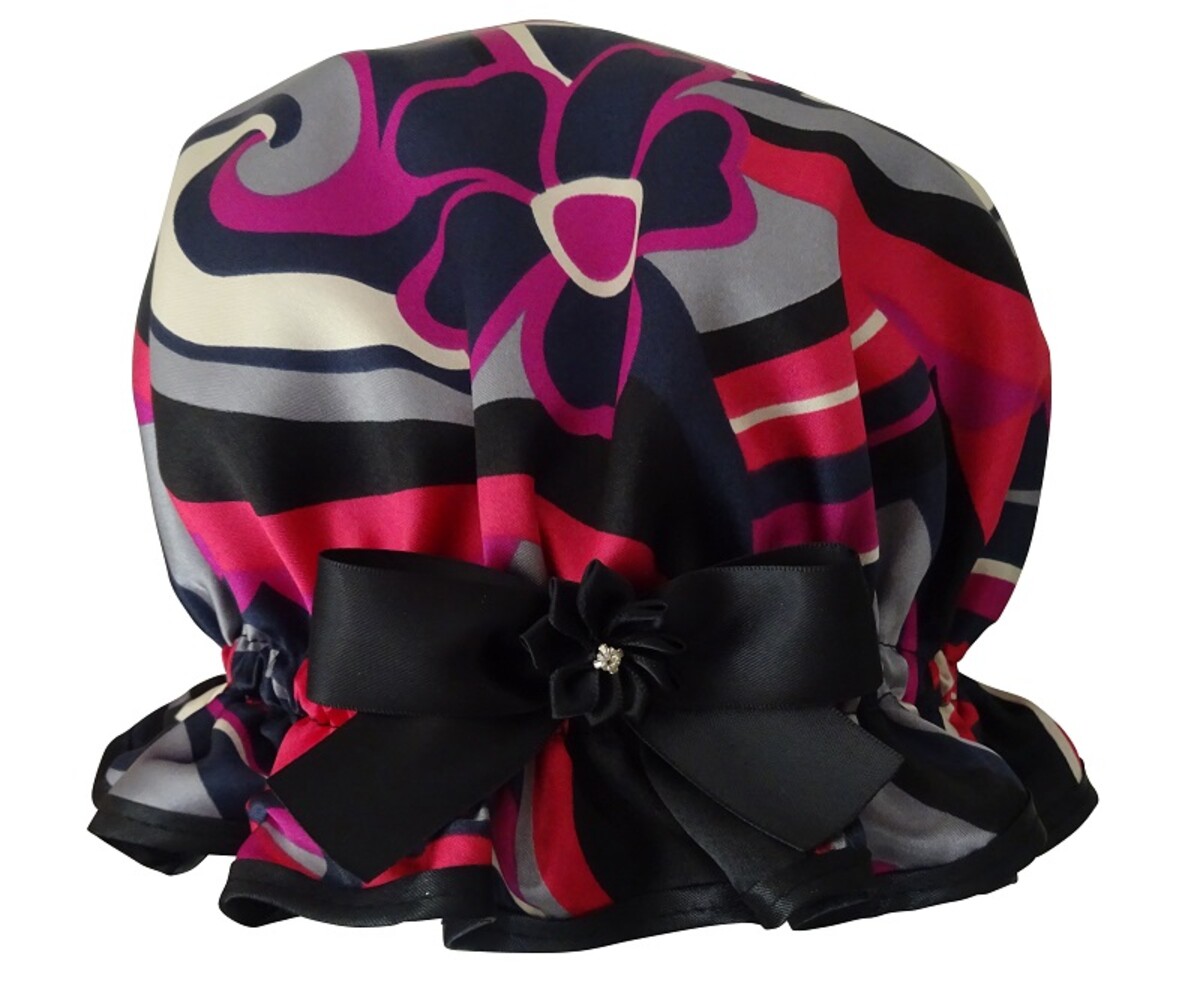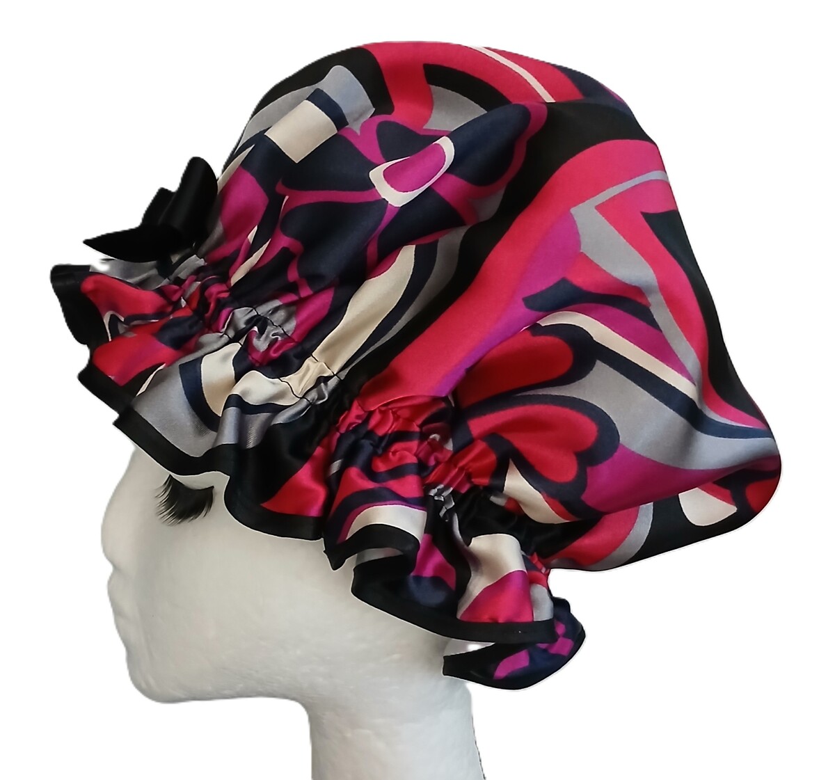 The So Pretty Funky Gal shower cap is one of the original Vintage style shower caps that So Pretty created many years ago. At the time a very large quantity of this satin print was purchased with the realisation that it was going to be forever popular! And a popular style it is, with so many circles in this fabric having been cut and sewn since then. The Funky Gal shower cap is probably a more 70’s style pattern, but still appeals to this day, no matter what generation you are in. The Funky Gal shower cap is a combination of Fuschia, Hot Pink, Black, Grey and White in a Polyester Satin fabric. As with all the Ladies Shower Cap, they are comfortable to wear and made to last. Ideally they need to be left to dry between uses. So Pretty Shower Caps can be gently hand washed if need be. I have had Ladies say they have thrown them in the washing machine regularly, or bleached them and they have survived this onslaught. I wouldn’t recommend doing these things but it is at your discretion. If it becomes ruined then it is a great excuse to choose another replacement. Spoilt for choice here at So Pretty! The design may look vintage, but this style of shower cap with the frilled edge is similar to the headwear that servants or maids wore back in the Victorian era, just without the plastic. The Funky Gal also available is a Sleep Cap or Sleep Bonnet, these are still a thing and a useful hair accessory to tame the tresses whilst you sleep! Also as an XL Ladies Shower Cap, told you I had a lot of this fabric to play with!