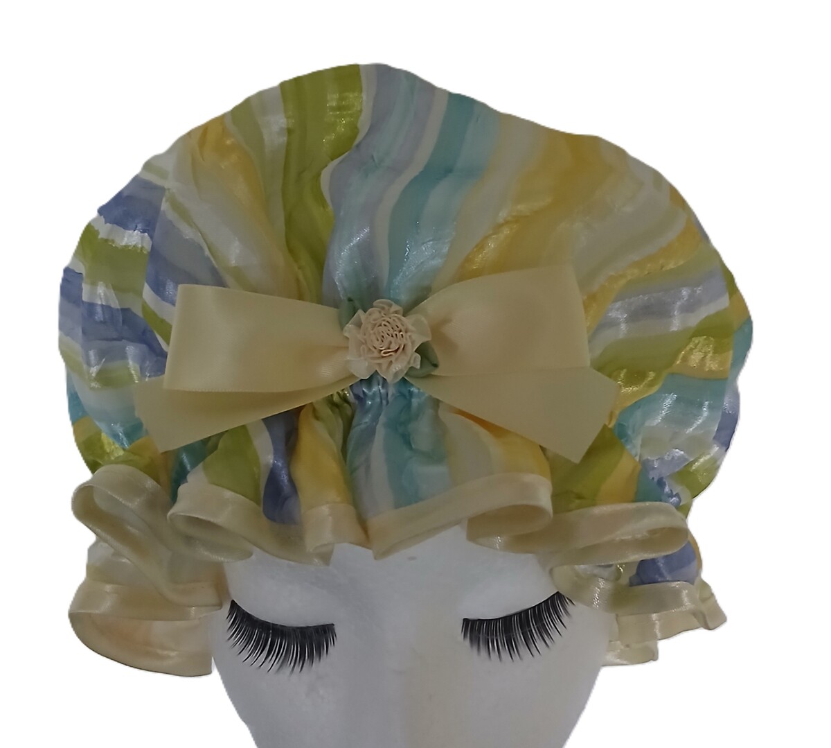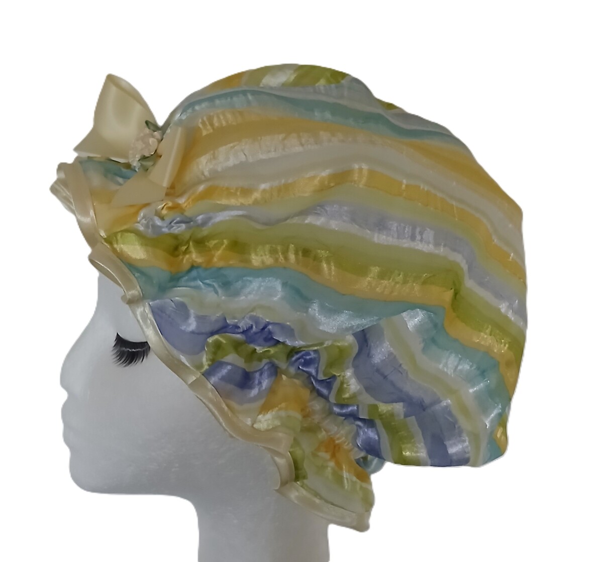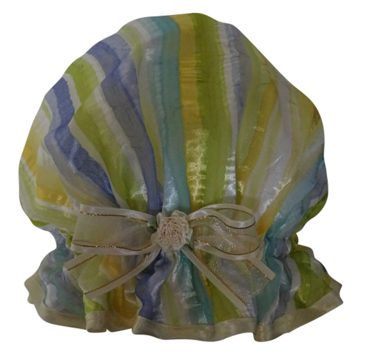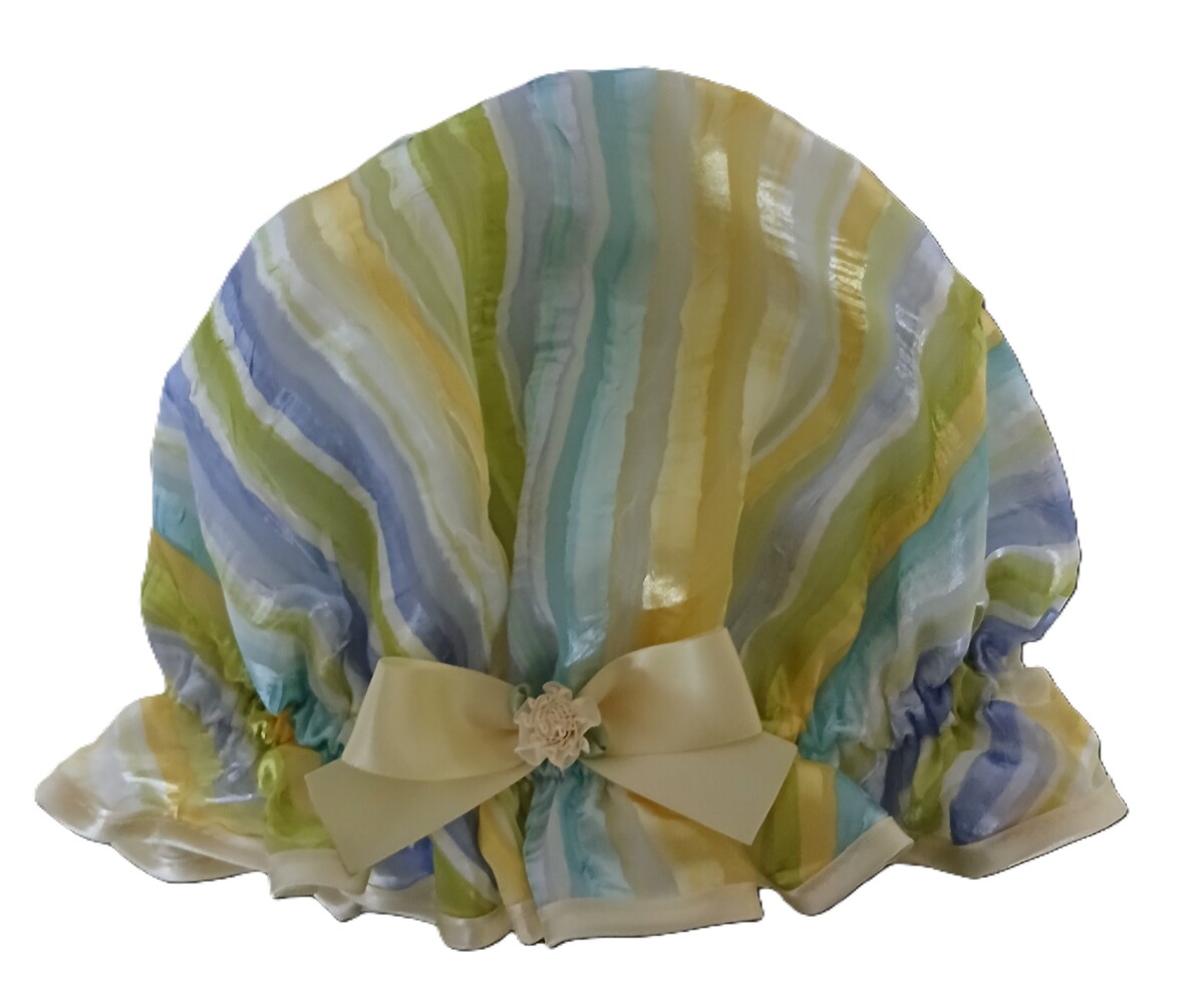 The So Pretty Shower Caps Gaiety colours are combinations of beautiful pastels in a fabric of which the closest description I can describe is like crushed ribbons of satin. These two shower caps, Gaiety Lemon & Lime, and Gaiety Lilac have been in the So Pretty Shower Caps range for quite some time and stock is gradually dwindling then it will be no more! They were named Gaiety as they are such a light and fun looking colour combination, they are sure to delight and appeal to many. The fabric has a glossy sheen to it along some of these strips of colour which adds to its uniqueness. I cannot image much else being constructed out of this fabric, would make a very outgoing blouse for instance! The So Pretty Gaiety Lilac is a beautiful striped combination of mauve, yellow, cream and greys with gold thread highlighting the stripes. This shower cap is edged with a buttercup yellow satin trim, matching organza ribbon and carnation flower. Should you or you know someone who quotes Lilac or Lavender as their favourite colour, then this Gaiety shower cap would be a perfect hair accessory. The So Pretty Gaiety Lemon and Lime is a mix not only of these two colours, but also includes hues of soft Aqua and Blue. Overall a very pretty shower cap and would look "so pretty" adorning your bathroom. Similarly finished off with a satin carnation ribbon flower. Can imagine this design looking good in a beach themed bathroom with these colours being the highlight!