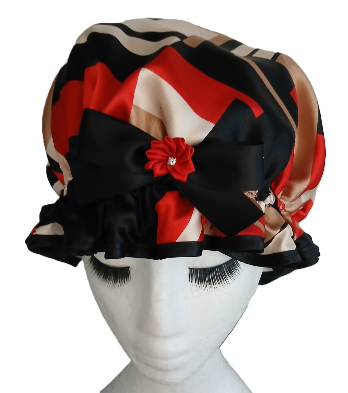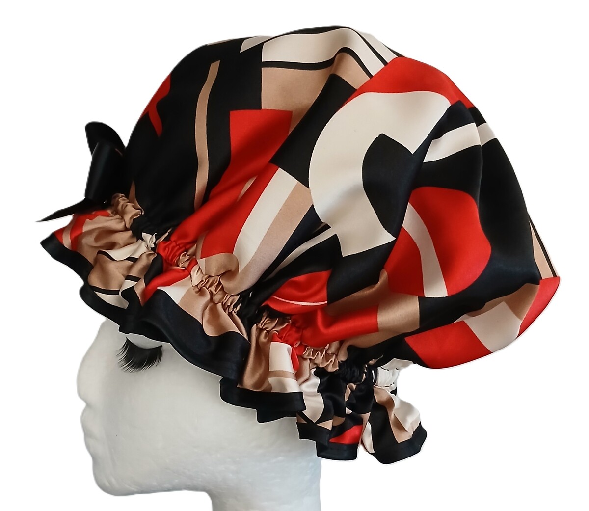 A So Pretty Ladies Shower Cap in a bold and abstract satin print combining Red, Black and Tan. Embellished with a matching Red ribbon flower with a Rhinestone centre. Why did I call this Geometry? Well mainly since it has a variety of shapes like squares and rectangles going on. (The name for the So Pretty Shower Cap as "Test Pattern" came to mind but that would be really really boring, even though it looks EXACTLY like the old ABC Australia test pattern but in colour!) Remember the days ot test patterns on television before the shows would even start for the day?!! Showing my age a little with this bit of trivia sorry! I know Maths is uninspiring for most people but I live in the forlorn hope that bringing this shower cap into the So Pretty shower caps collection will change all that. Not expecting much, but it is a great looking shower cap nevertheless, and a practical hair accessory as well. Whether you relate it to Geometry, Algebra or Trigonometry or none of these mind boggling subjects, it remains looking the prettiest part of your bathroom décor once it adorns your bathroom, wherever that may be. Perhaps this particular shower cap may even be an appropriate suggestion as a Teachers gift, especially if they are a Maths teacher. Surely they would recognise and associate the shower cap name with the pattern! Perhaps then if you are their student they would certainly never forget you for giving such a unique thankyou gift.