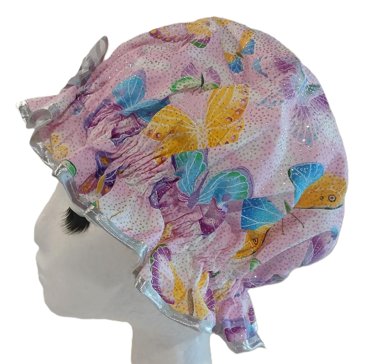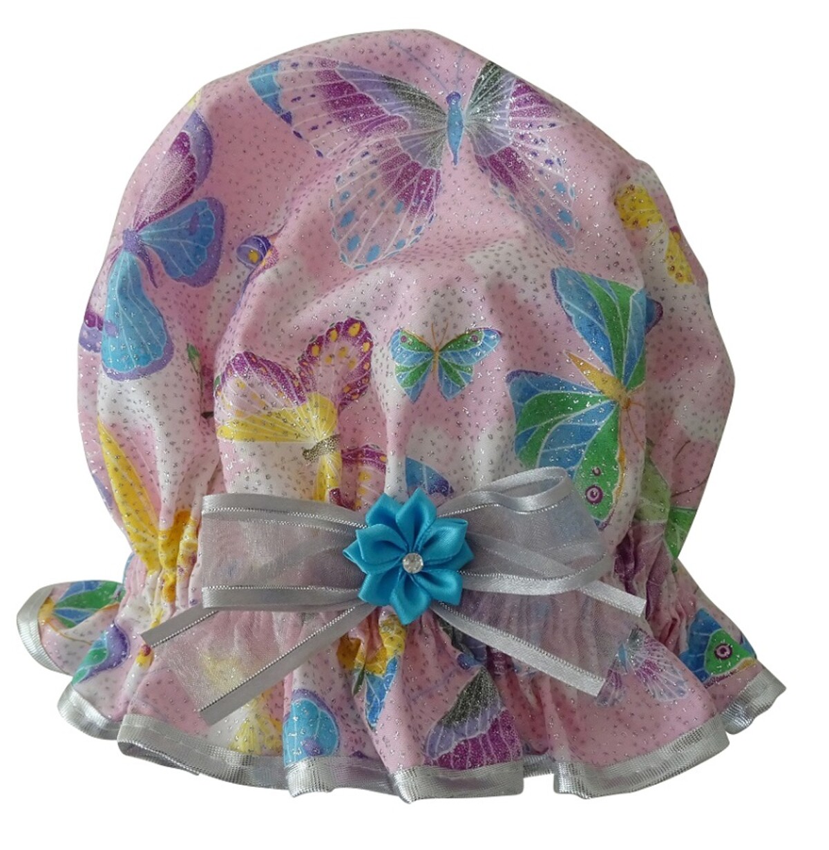 Who doesnt love butterflies, and this So Pretty Girls shower cap named Glitter Butterflies is the prettiest with plenty of them! Butterflies have always been a delightful creature to behold, and it is always special when you see one. Here in Australia we don’t naturally see many varieties as the really gorgeous ones are found in tropical zones of the world. Still, the Glitter Butterflies shower cap will delight Girls since it is so colourful and sparkly. (They will want to wear it all the time believe me) The So Pretty Glitter Butterflies shower cap is covered not only with Butterflies, but the sparkle covers the whole pattern as well. So it is a very glamourous hair accessory which any Girl would love! This Girls shower cap is embellished with a Silver Organza ribbon bow with a perfectly matching Aqua ribbon flower that also has a sparkly Rhinestone on it! What is there not to like about this So Pretty Shower Cap! As a suggestion if you wanted to have a Mother/Daughter Butterfly themed set, in the Ladies shower cap range there is a shower cap named Butterfly Garden. Totally different fabric but we are matching Butterflies here. Girls love to copy their mothers so this could be an option for you both! Else if there is a big sister around the age of 10 or so, the Ladies shower cap would be suitable for her as well. The Girls size So Pretty Shower Cap can fit an Adult by the way, just is a snug fit depending on your hair length, which if you don’t like the bouffant look, just may be all you want!