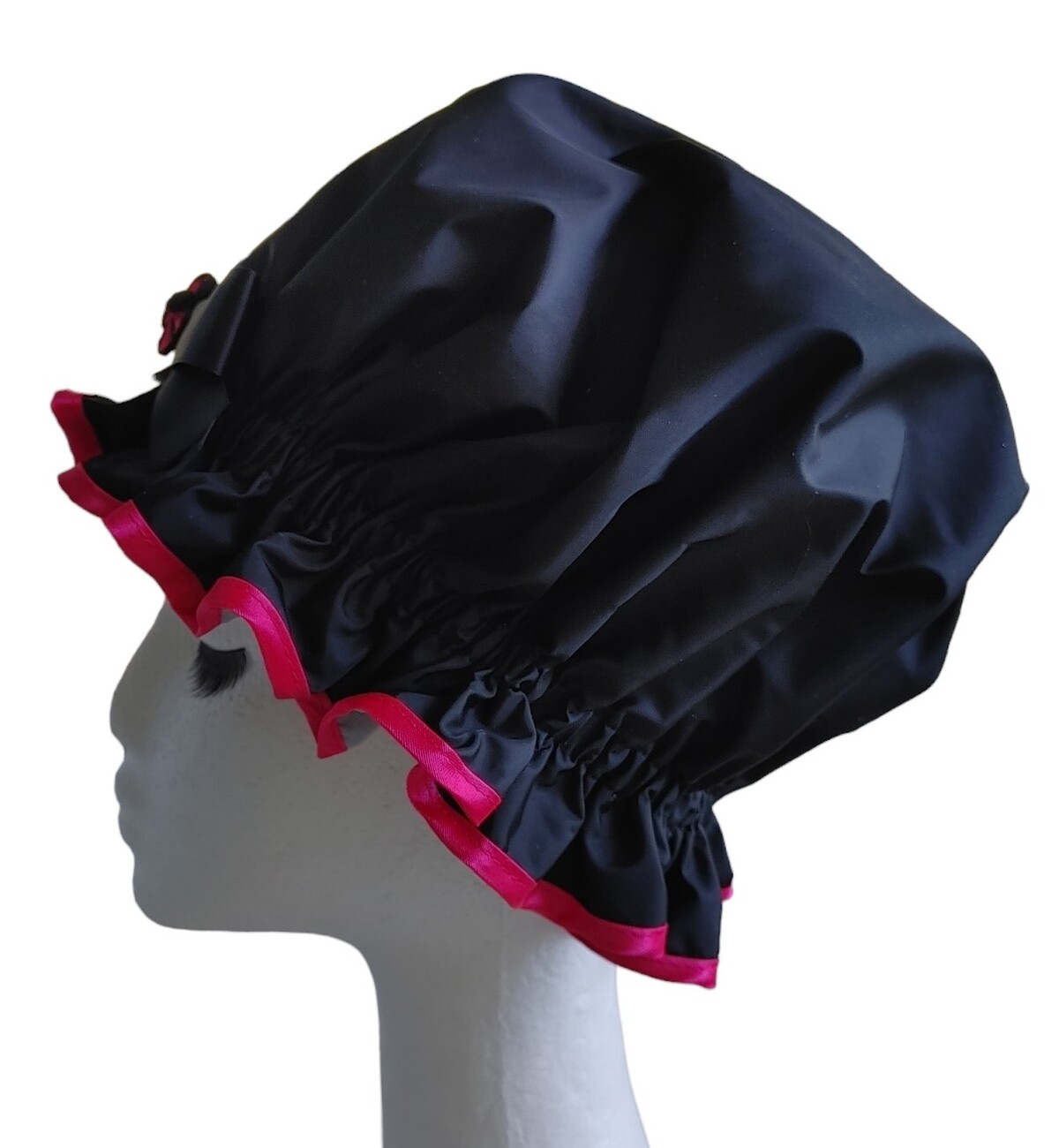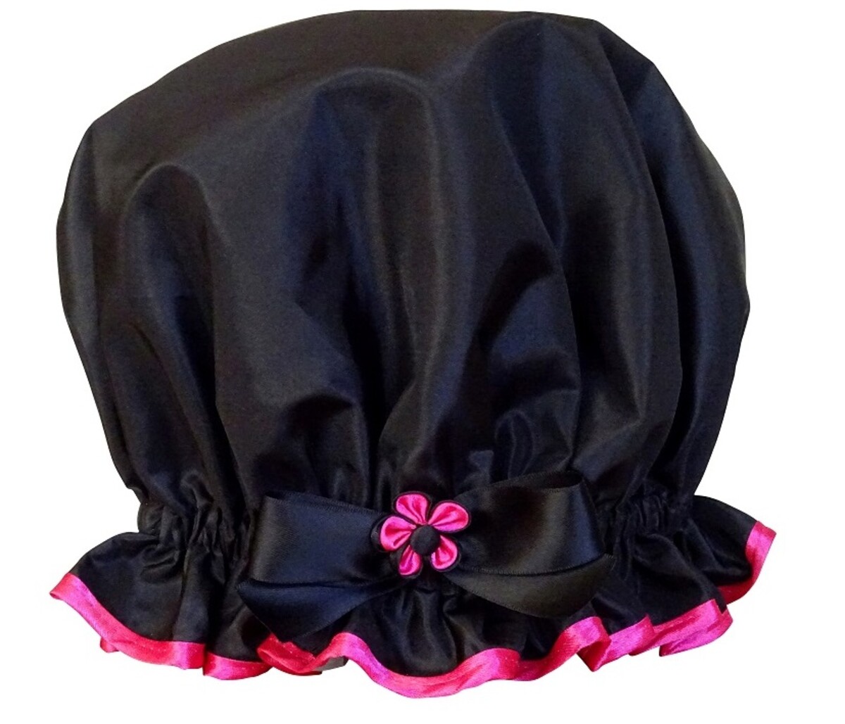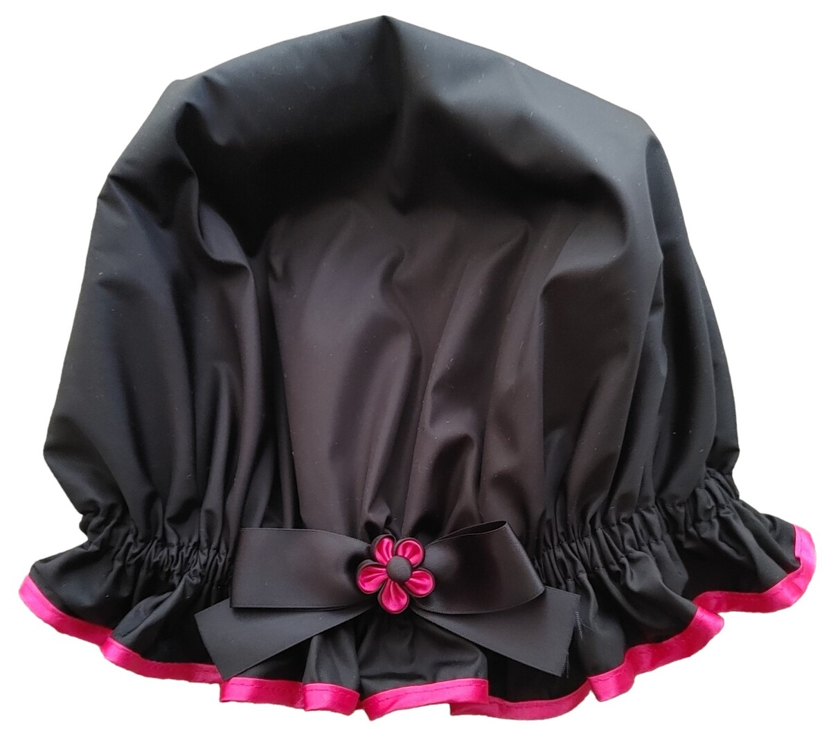 So Pretty Hot Shot Black is one of several Black variations available. This version being Black with Hot Pink satin edging. As well there are other similarly named “Hot Shot” So Pretty shower caps, this is the Black variety! The So Pretty Hot Shot Black has a perfectly matching ribbon flower being Hot Pink with Black edging as well, could not imagine a better compliment to this shower cap really.