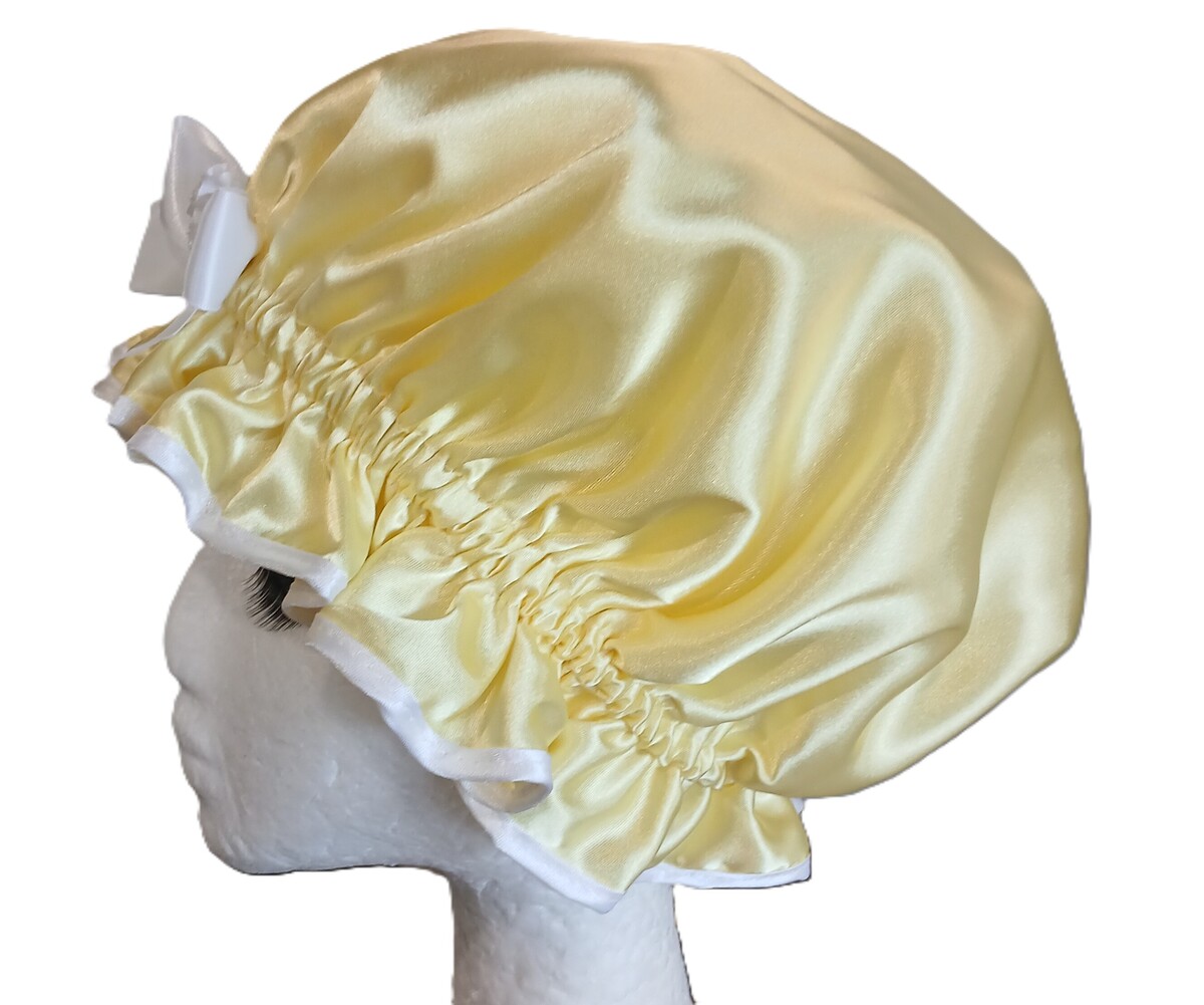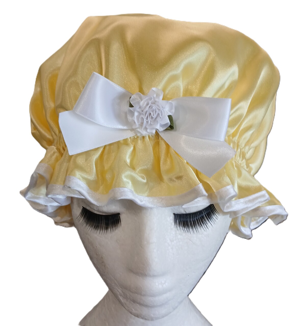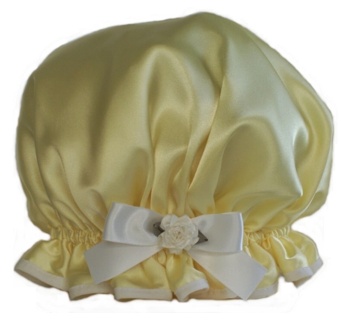 So Pretty Shower Caps Lemon Pretty is simply a pretty pastel yellow shower cap for those who love practicality yet not bothered with the glam so much! Charmeuse Satin has been used in this So Pretty design so it will look fabulous whilst you are using it as well as afterwards whilst it is just decorating your bathroom! Edged with White satin and a satin carnation ribbon flower for an added touch of style. This is a no frills shower cap that has frills! Keeping it simple with plain colours can be the sensible option for bathroom accessories and décor. Even with bathroom renovations, trends come and go and before you know it, that bathroom you reinvented 10 years ago suddenly looks out of date yet again! This was a rule an interior designer explained to me many years ago, keep it simple and neutral and it will not age! Luckily with So Pretty Shower Caps you can go either way, as they are made to last since they are hand made quality. So if down the track you do change your bathroom décor, it no drama and actually a delight to change the colour or pattern of your shower cap than it is to tear down the walls and start all over again! It is a wonderful feeling having finished a major overhaul of your bathroom, then adding the final touches of matching towels, mats and finally the glamour shower cap! Even a His n Hers shower cap may be the start of a new trend in your household!