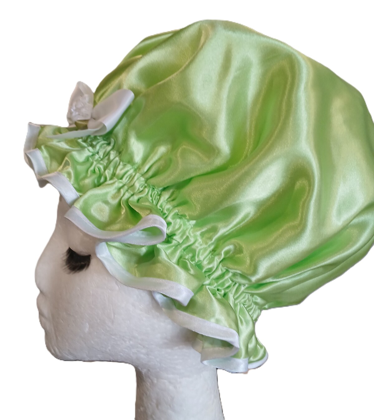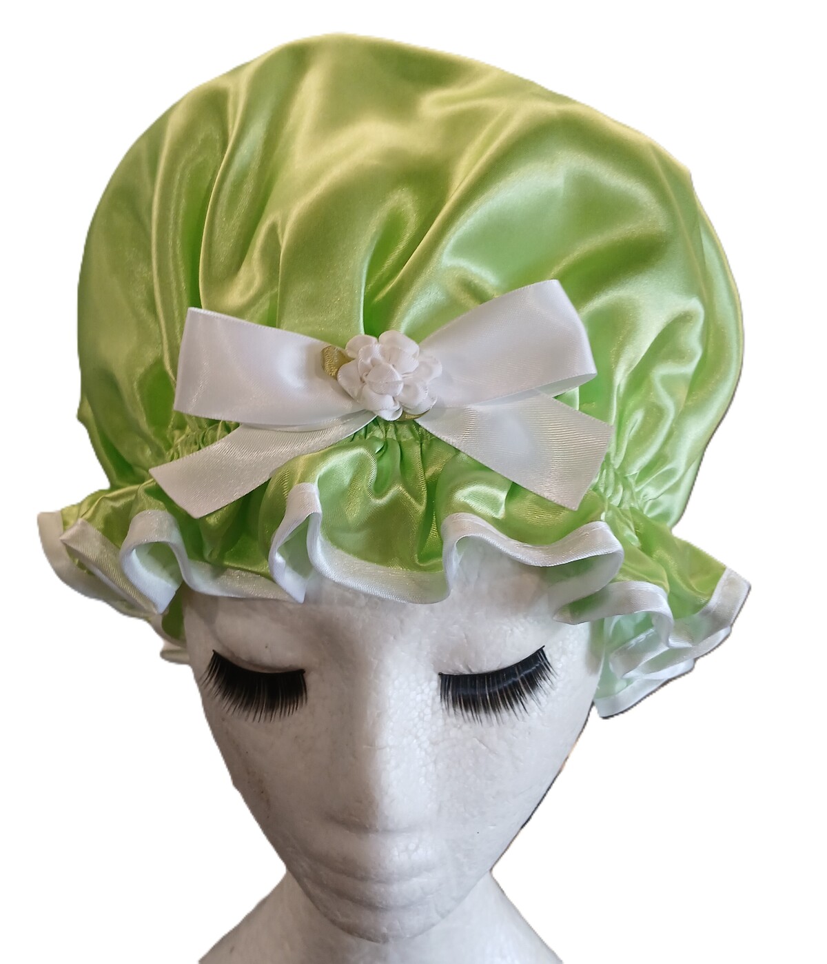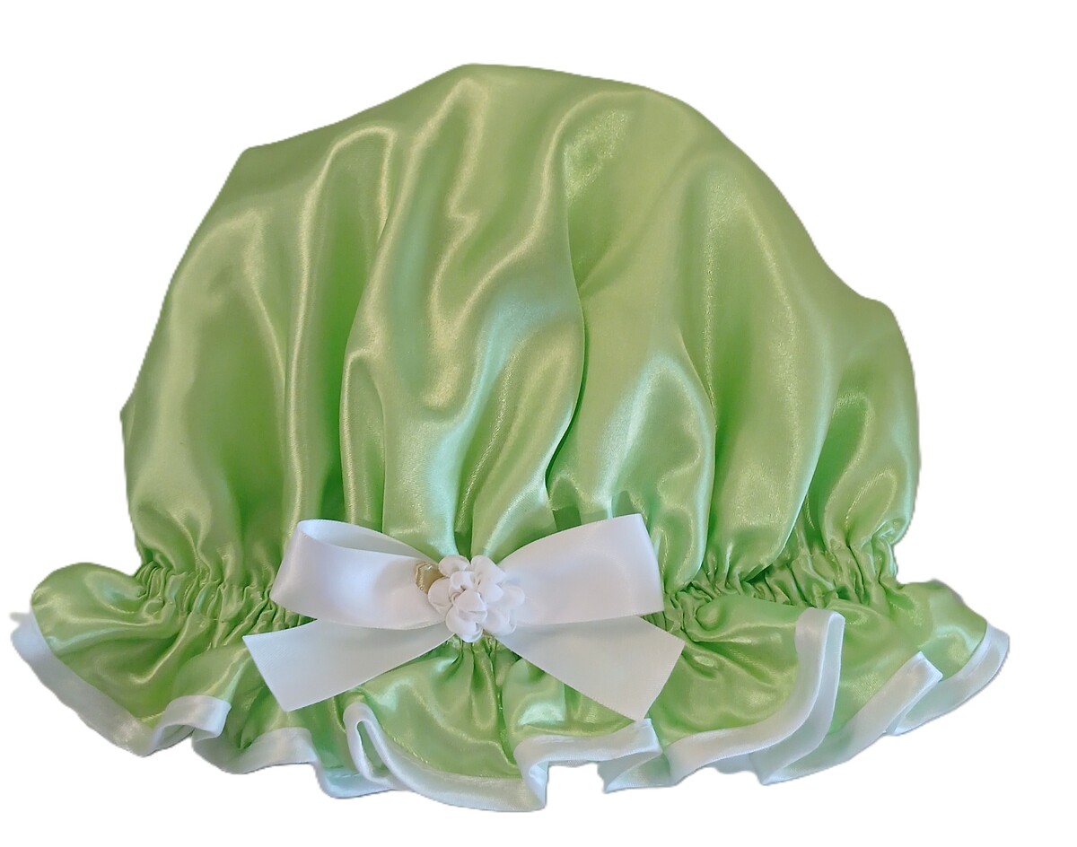 So Pretty Lime Fresh is definitely a fresh looking shower cap in this pastel shade of Green and White trim. So Pretty has a large variety of shower caps with Green as the focus colour, Lime Fresh is one of the softer and more toned down options you may be looking for! This So Pretty Shower Cap is created using Satin Charmeuse fabric, one commonly used by So Pretty mainly for the plain colours available in this material. Apart from the fact it transforms into a perfect shower cap, Charmeuse is readily sourced locally. Having a fabric that is in constant supply is important for continuity of the range as well as being an expected option to be able to select shower caps of basic colours and reordering if it is loved. Hence there are some combinations of plain colours and trims that have been with So Pretty Shower Caps since it first started in 2002. Others have developed with customer requests and fashion trends. On the other hand, many So Pretty Shower Cap designs disappear forever due to the sourced fabric being a one off opportunity. This can be disappointing when a particular shower cap is adorably cute, or particularly glamourous looking then cannot be replaced. But it leads to an interesting turnaround of designs that makes So Pretty Shower Caps stand out as a supplier of a huge variety of shower caps that are ever changing. By the time you need to replace your shower cap, there are sure to be many new options of shower caps to challenge your executive decision making skills!