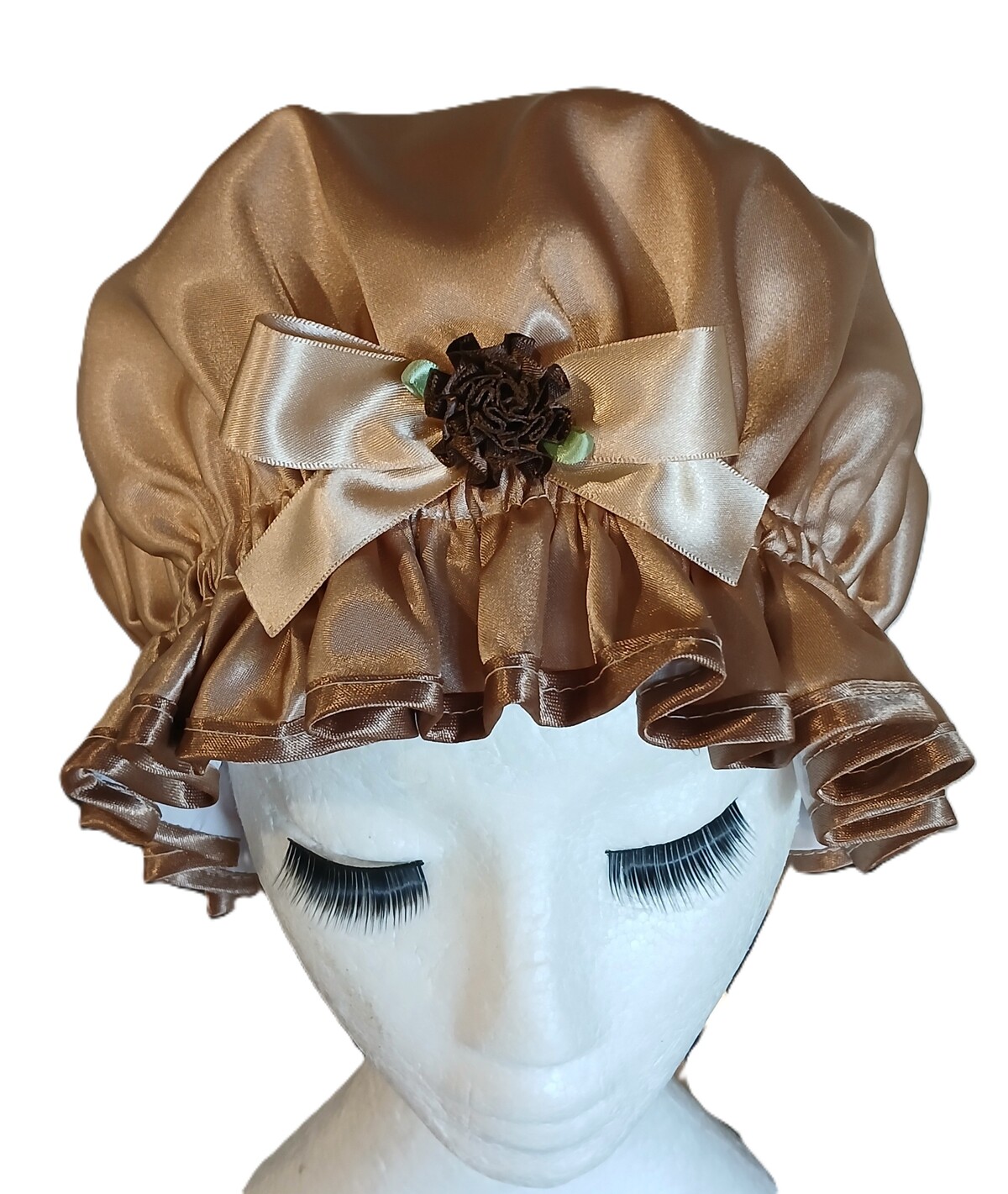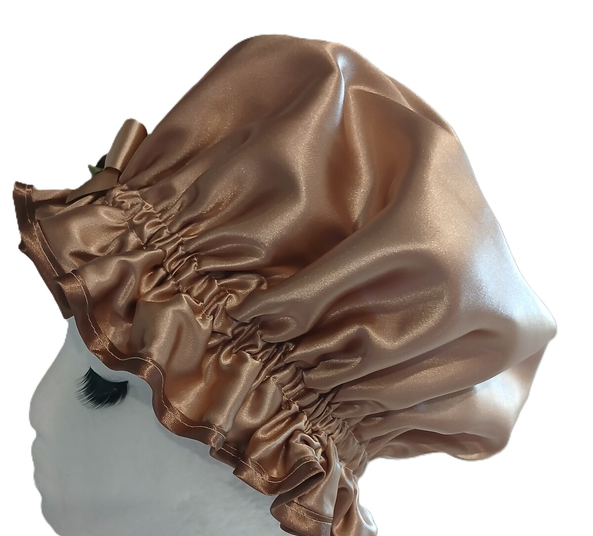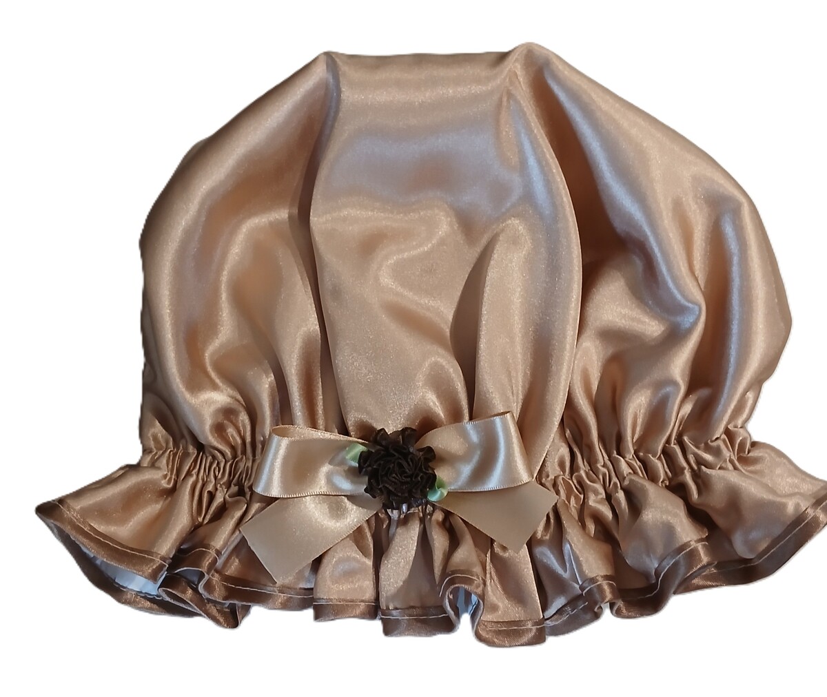 The Coffee Cream So Pretty Shower Cap is a pastel shade of Light Brown in a Charmeuse Satin. Is one of many shower caps in the So Pretty range that are in Brown tones but the Coffee Cream is more neutral and less flamboyant. The Coffee Cream suits those ladies who love a quality shower cap but can part with the glam! Or you have made the big sacrifice to go neutral just to match your bath towels when you would really like a sequinned shower cap! Ladies are constantly making the sacrifices aren’t they?