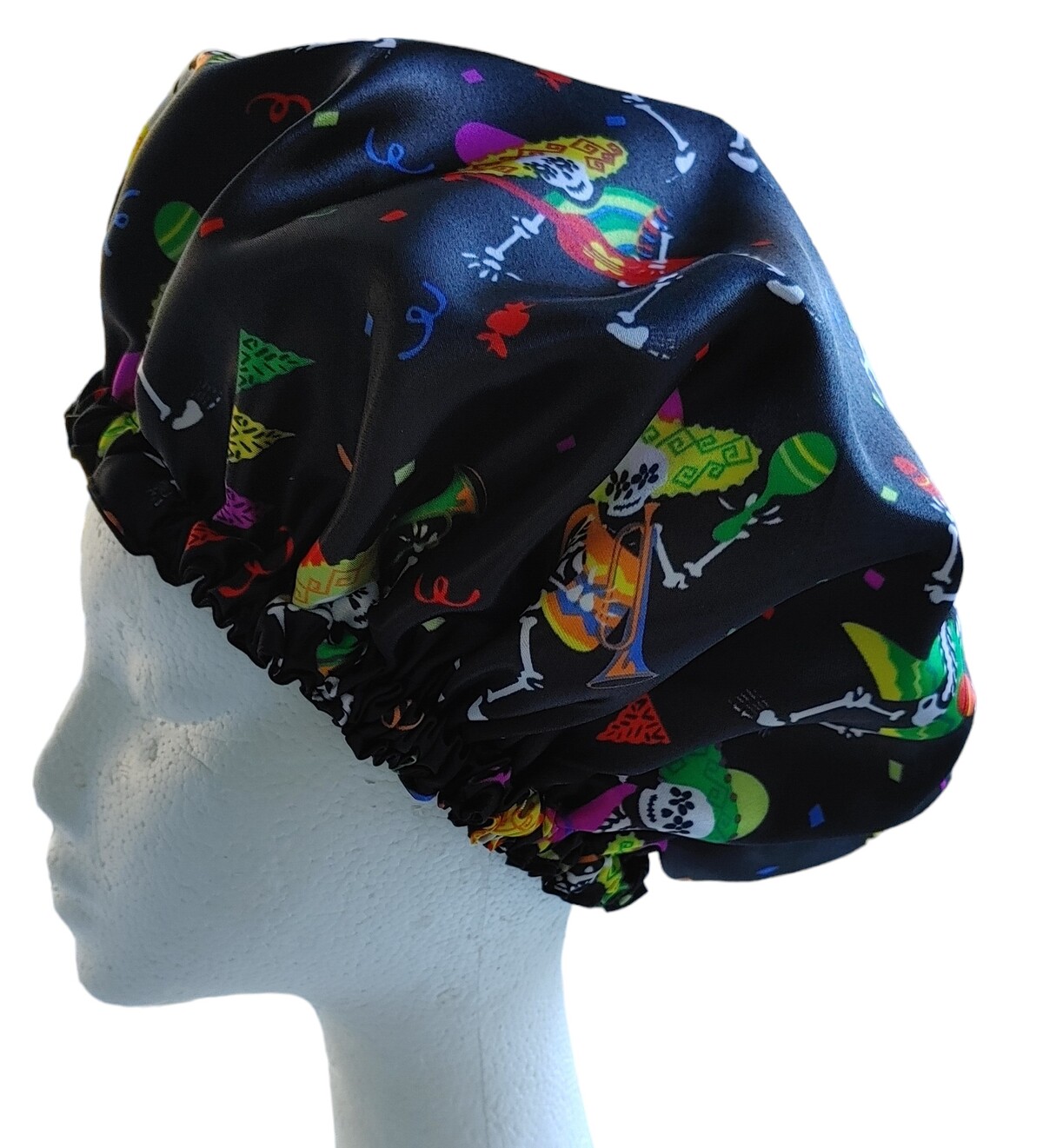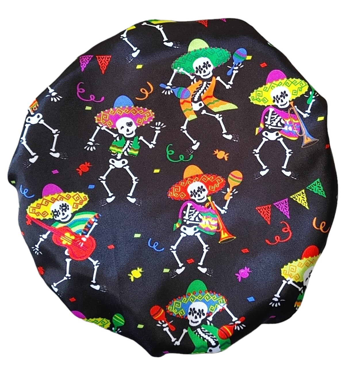 This So Pretty Mens Calavera shower cap is a Satin print celebrating Day of the Dead, and these happy skeletons are dancing all over the place on this design!
