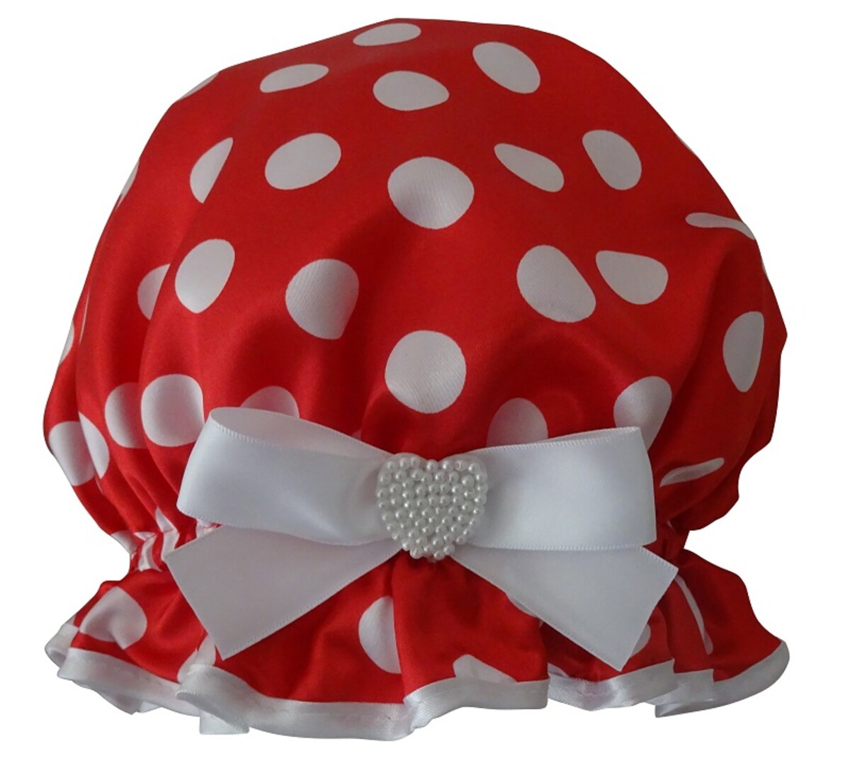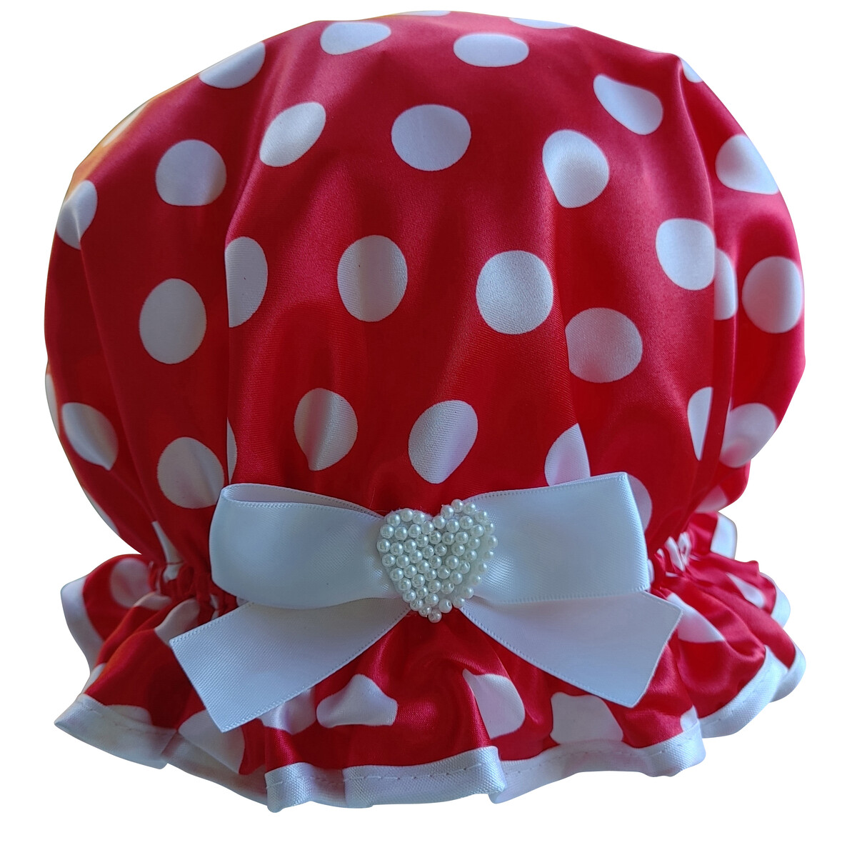 This is the original So Pretty Minnie Shower cap in a classic Red with White polka dot design that has been made famous by the fabulous Minnie Mouse. Disneys Minnie Mouse is a household name and the red and white polka dot accessories that abound as a result of that popularity, is truly outstanding! So why not a shower cap I say! This Minnie shower cap has been a regular listing for such a long time, mainly because the red with white polka dots is so popular. This proves to be very helpful in respect to restocking the fabric! Something that can prove difficult for a popular design when So Pretty Releases them. Still it is lovely to have the regular and almost expected shower caps available, and others that come and go. Makes it way more interesting for you as a customer and me as the creator! Tastes can change too, what may be your favourite colour combination or what you are a fan of, can change by the time you need to replace your shower cap. Since So Pretty Shower caps are handmade quality and made to last, there can be quite some time between these choices if you do want something a little different next time!. But the plan is to always have some form of Minnie about so don’t panic or no need to bulk buy! The So Pretty Minnie shower cap is a fun print. So much so it is also available in the smaller Girls size. Hence a Mother/Daughter matching shower caps can be happening, and little girls love Minnie as well! Should a guest happen to see this in your bathroom it gives them somewhat of an insight to your personality and sure to be a point of conversation!