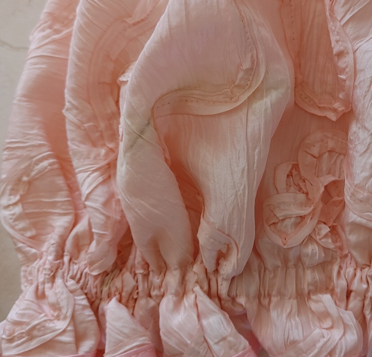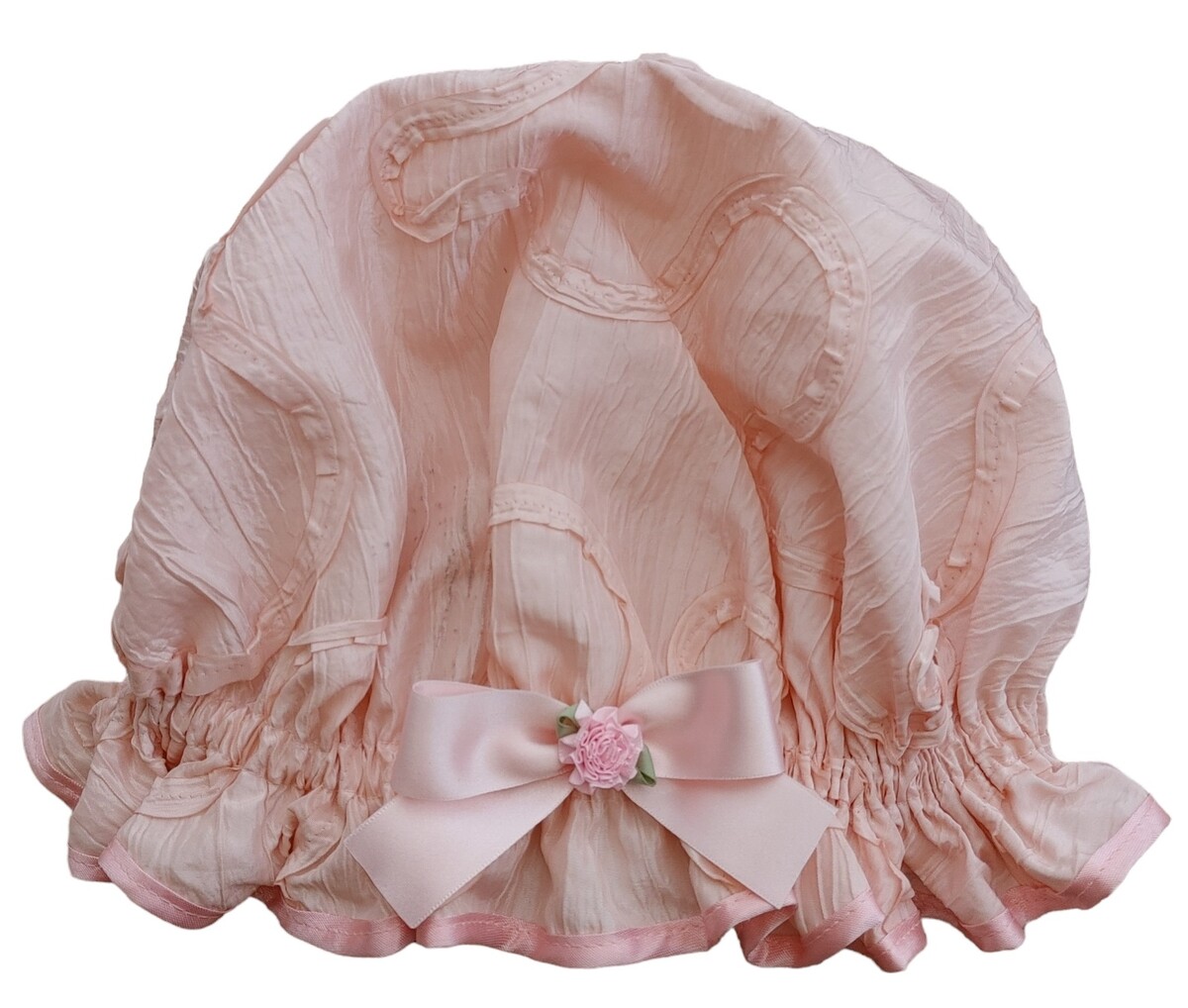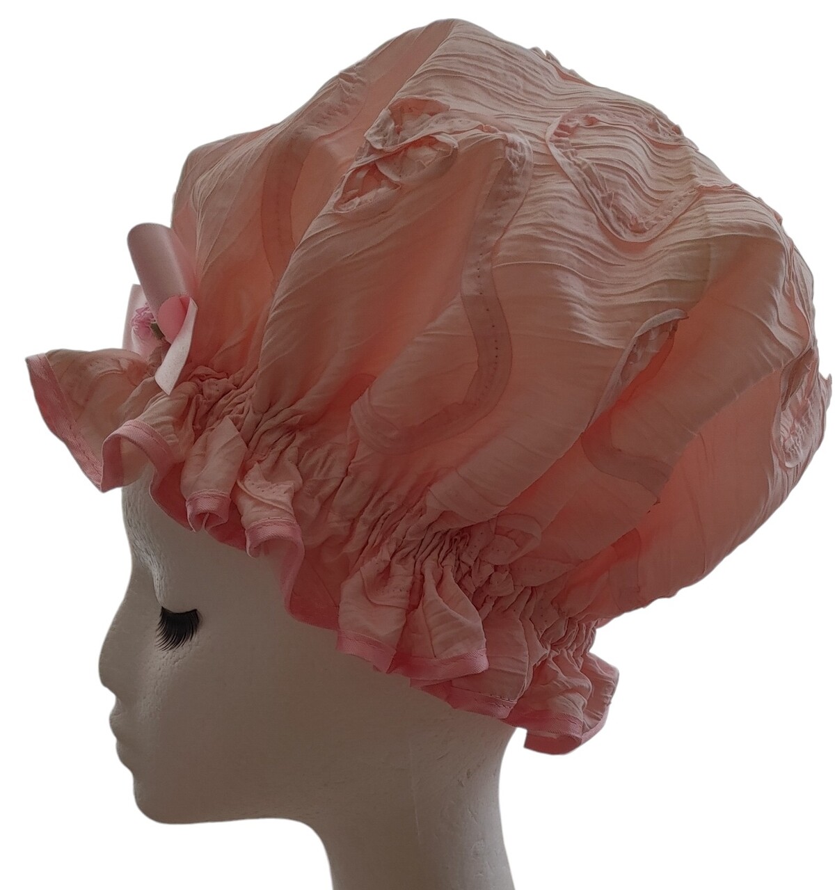 The Mon Cherie shower cap is constructed with a crushed Taffeta that is particularly enchanting. Soft yet slightly crisp in texture so holds its shape well. Even dries quickly and effectively! So feminine, this has been a shower cap of choice for gifting at bridal showers and I can see why. A very stylish pink and fabric indeed. It is totally pink, pink and more pink with the satin ribbon bow and carnation flower both matching perfectly!