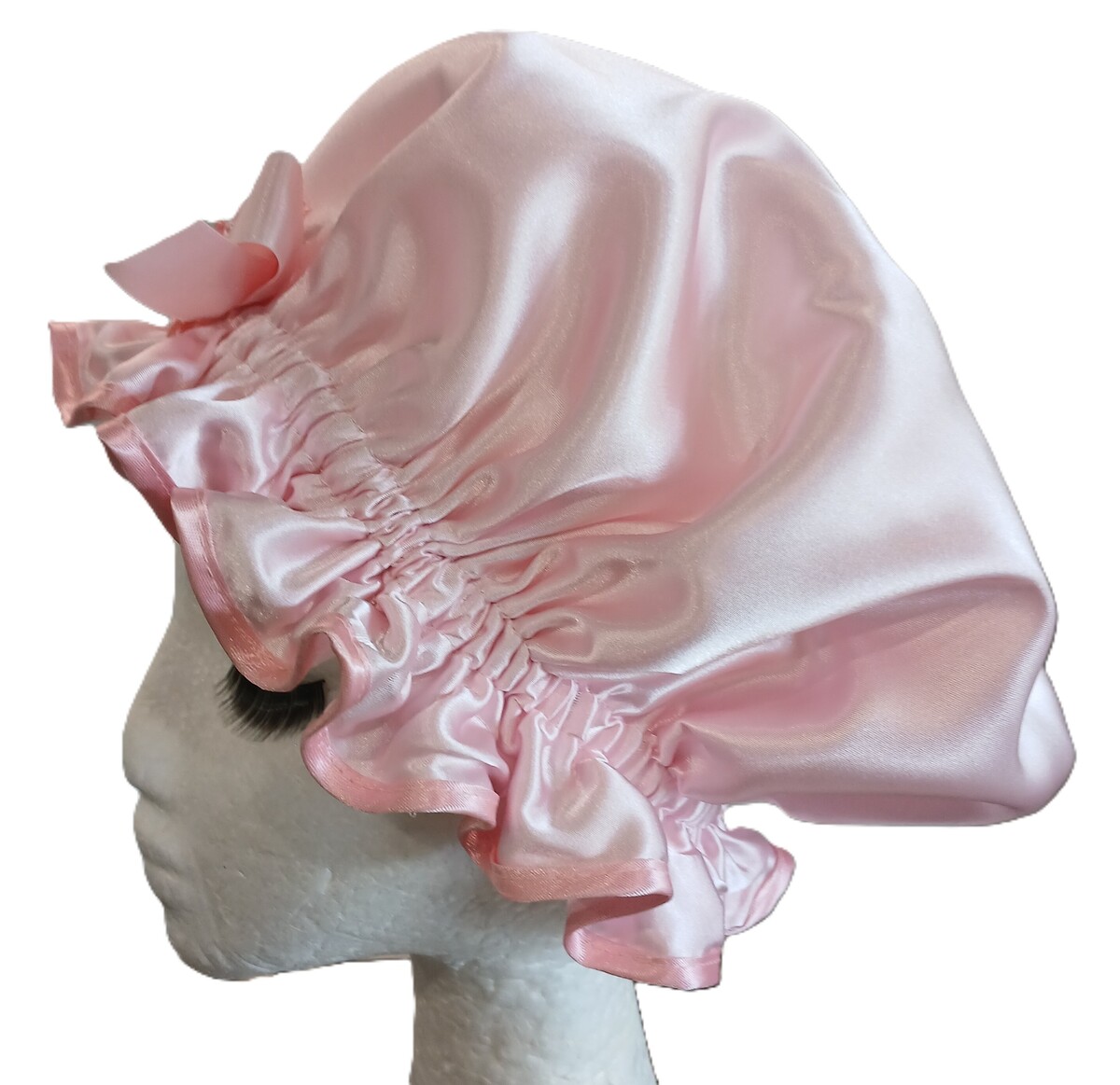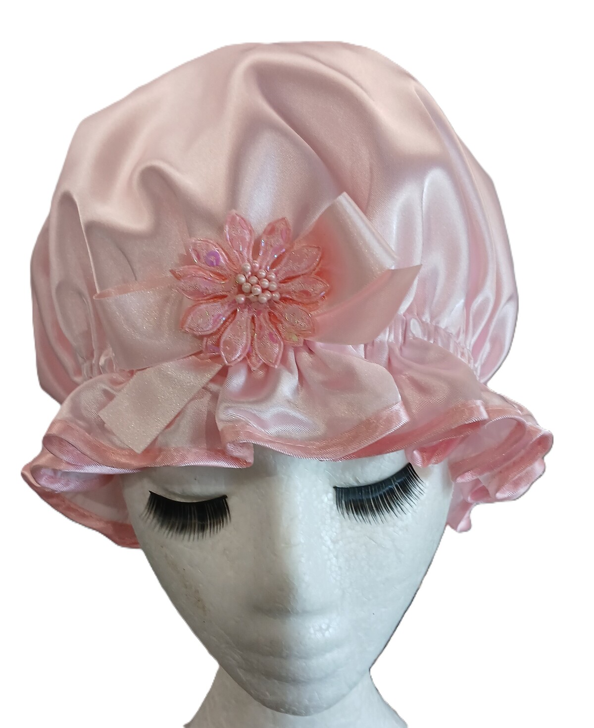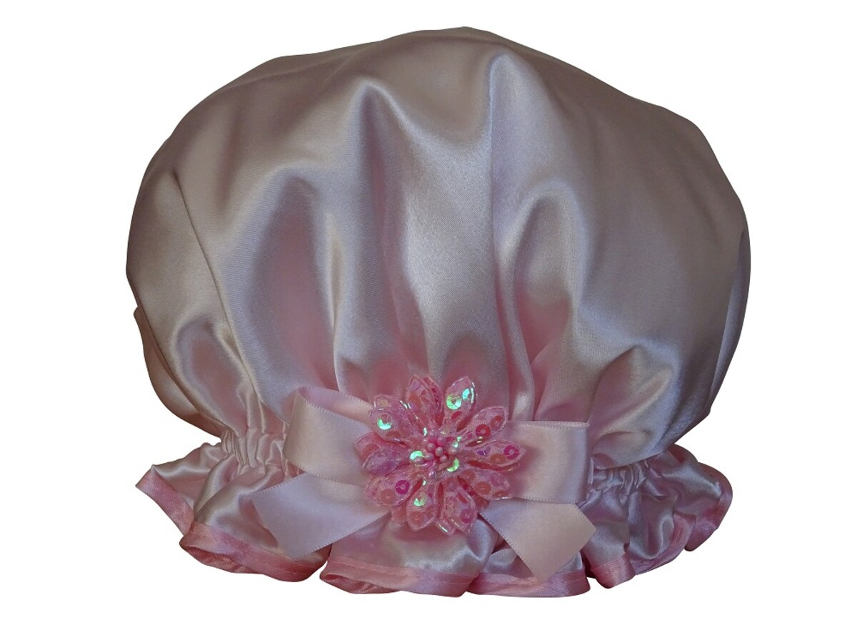 If Sorbet is described as a simple version of ice cream, then the So Pretty Pink Sorbet would be a simple yet classic version of a Pink shower cap! Pastel Pink Charmeuse is the fabric used here which is a soft version of Satin and is perfect for creating a shower cap. Charmeuse is a fabric that not only looks great, it does not crush so will display beautifully when not in use. The large sequinned flower added to this shower cap adds some real dazzle to what would be a plain shower cap otherwise. Plain, but definitely not dowdy…its takes a boring piece of clear plastic to be in that category! Like that was the only option not so long ago in the scheme of things. So Pretty Shower Caps changed all that in 2002! Pink is eternally popular for fashion as well as accessories. Usually allocated as a colour for Girls, especially newborns, or even Baby reveals which are more popular these days. Nothing is a secret any more but it is still an exciting event. Perhaps if you know the sex of a baby for a friend, gifting a Pink Sorbet shower cap to the new mother is a lovely baby shower gift idea. Mothers need to be made to feel special too, particularly in the first few weeks of motherhood. Not having time to wash and dry your hair every day makes a So Pretty Shower Cap a very useful hair accessory to have indeed as well as being a pamper product for a tired mum!