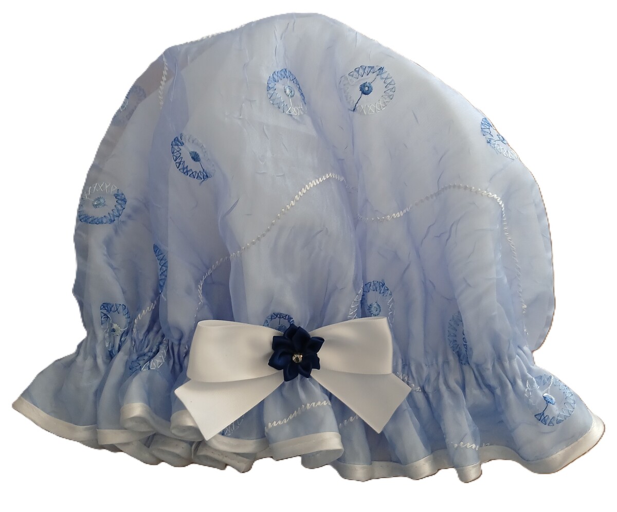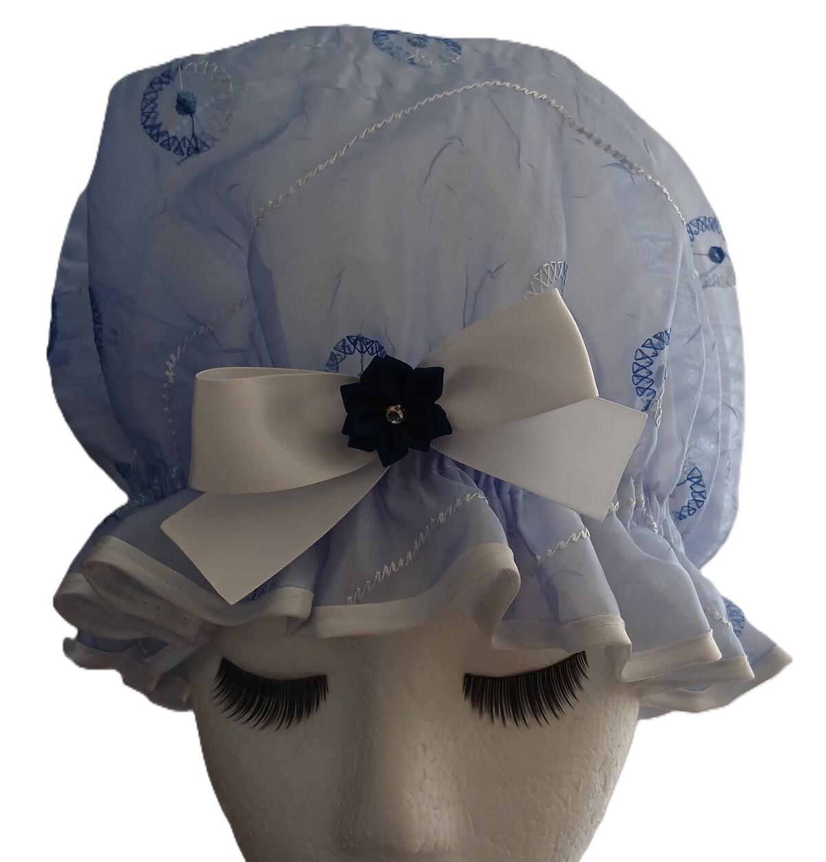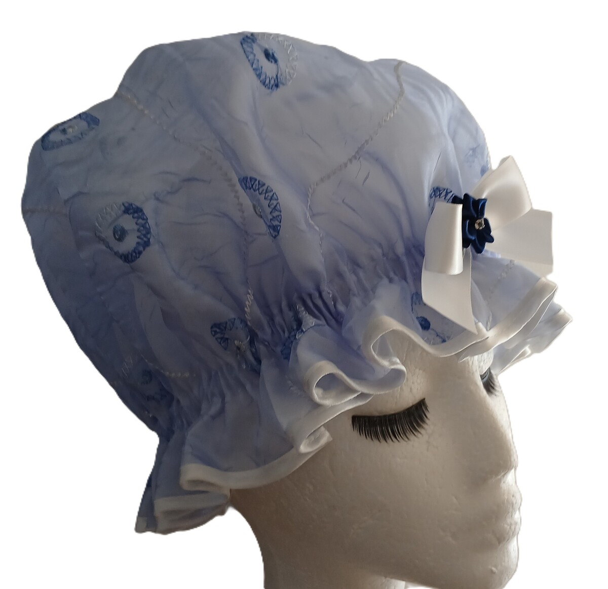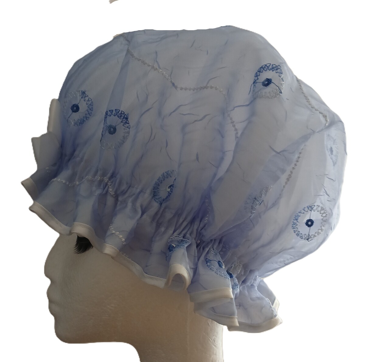 Polar Blue is a classy addition to the Blue shower caps that So Pretty has on offer. The So Pretty Polar Blue shower cap is sheer and very lightweight in a crushed and embroidered organza. Inspired by the colour of an icy blue ocean, hence the name! Polar Blue is a unique fabric made or the more special as it was sourced from India! Since purchase it was waiting to become a shower cap creation for some time. But now that it has been cut and sewn, it is a delightful addition to the So Pretty collection! Because it was a smaller purchase, subsequently there is not a huge amount of this stock available with the limitations of travel, so if this is a Blue shower cap that you think will be the shower cap of your dreams, then best to add to cart now! Trimmed with White satin edging and contrasting Dark Blue satin ribbon flower, this shower cap would look quite special hanging around even on your tapware in the bathroom. As long as you leave it to dry after use the So Pretty Shower Caps will serve you well. Being such a sheer fabric the Polar Blue Shower Cap will dry very quickly for you. This is particularly a bonus if you need to move on and travel after having a shower. They not only look good, they are made to last, which is one of the biggest reasons it is worth owning a quality shower cap. Far outweighs the waste of disposable shower caps on so many levels!