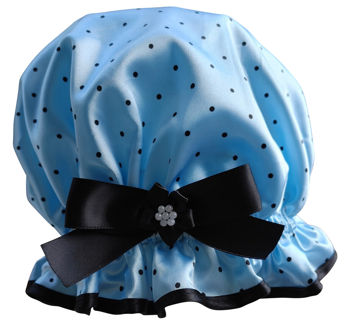 The So Pretty Polka Dot Blue is embellished with a Black satin ribbon flower that is centred with faux pearls, adding a touch of class to what is a quality hand made product. Sorry to say they are faux pearls, would be lovely to offer a product with the real deal but that would be a shower cap in a whole new price league (which I am sure there would be some who would not blink at that idea!). Still a So Pretty Polka Dot Blue Shower Cap is something special even with its faux pearls, a hair accessory that is practical and well made. Would make you feel just as special as if those pearls were real!