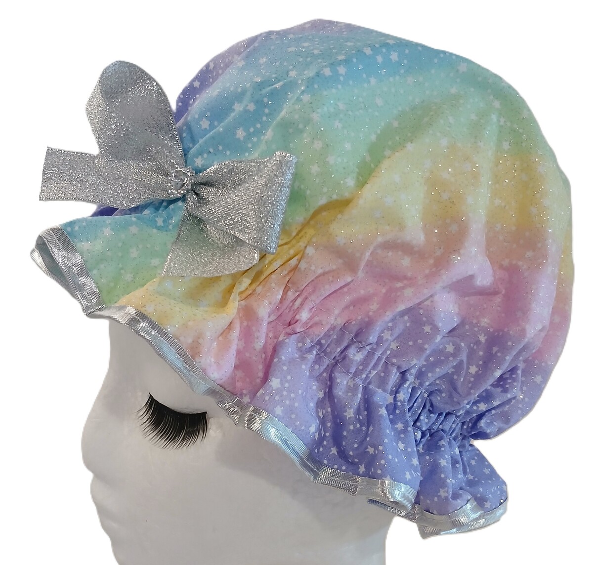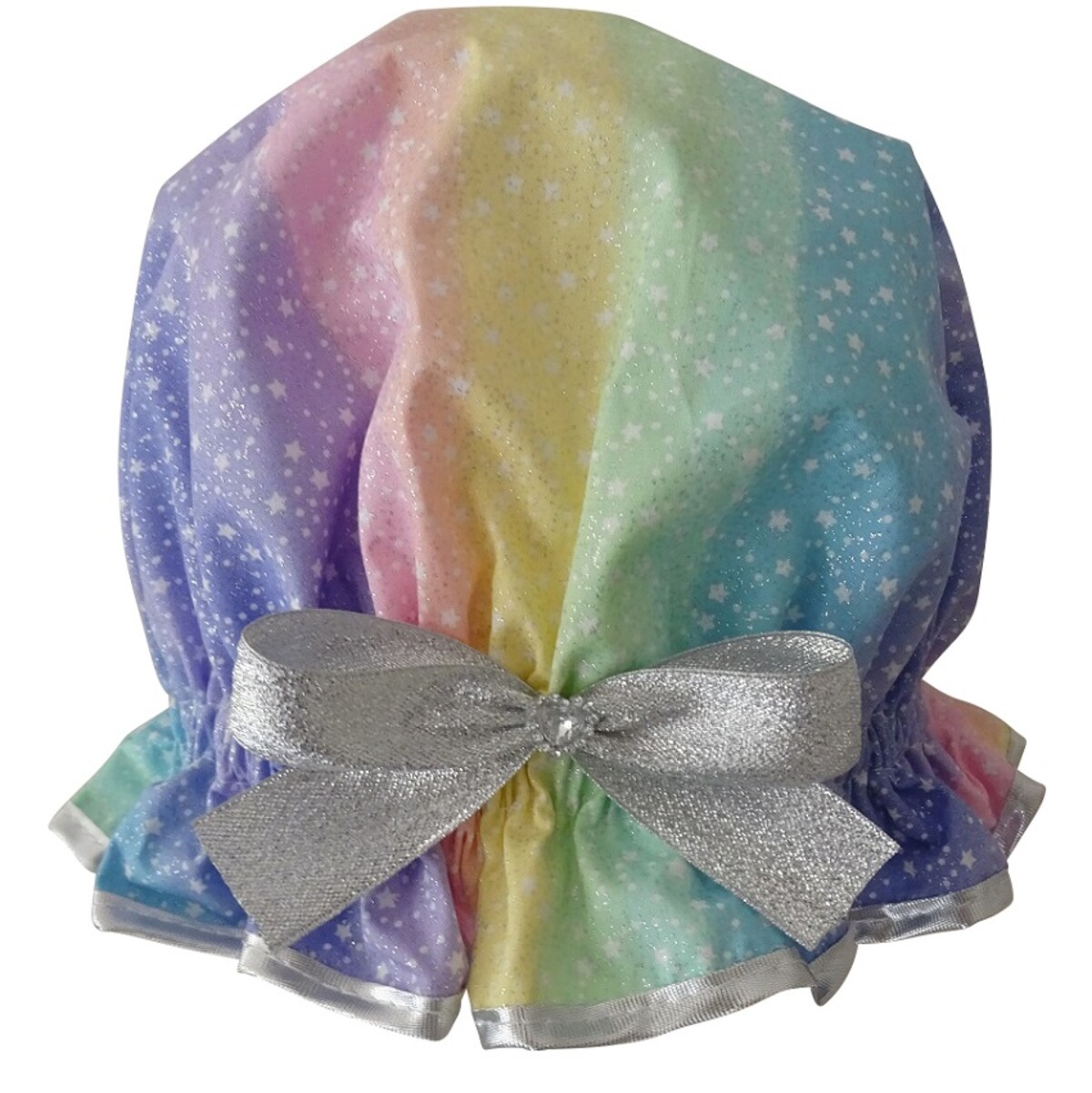 Keeping a girls hair dry at shower or bath time has never been easier with this delightful shower cap! The So Pretty Rainbow Sparkle shower cap will have Girls wanting to have a bath at any time of the day! The Rainbow Sparkle does just that, sparkle! It is a shower cap of all the pretty pastel colours of the rainbow but with the addition of glittery stars. Even a little Girls shower cap can be glam. So Pretty has created a cute yet practical shower for the younger ones that they are excited and willing to use! Given the choice, even a child would prefer a So Pretty Shower Cap over a dowdy piece of plastic! The So Pretty Rainbow Sparkle includes a matching Silver Lame ribbon bow with the cutest diamante love heart which she will adore. Be prepared for this shower cap to worn at any time of the day, or any of the So Pretty designs for Girls in fact! The So Pretty Girls Shower Cap range offers a practical solution to gifts for younger Girls, especially when Birthday Parties are a regular social event. Giving a So Pretty Shower Cap is a point of difference, something pretty and cute, yet hand made and practical. In this generation, children are often overwhelmed with so many toys and possessions which become passe very quickly. At least a So Pretty Shower Cap will be a hair accessory that will be a fun part of their daily routine. There are plenty of design options here on So Pretty, you may even want to match with a sister or Mother as well!