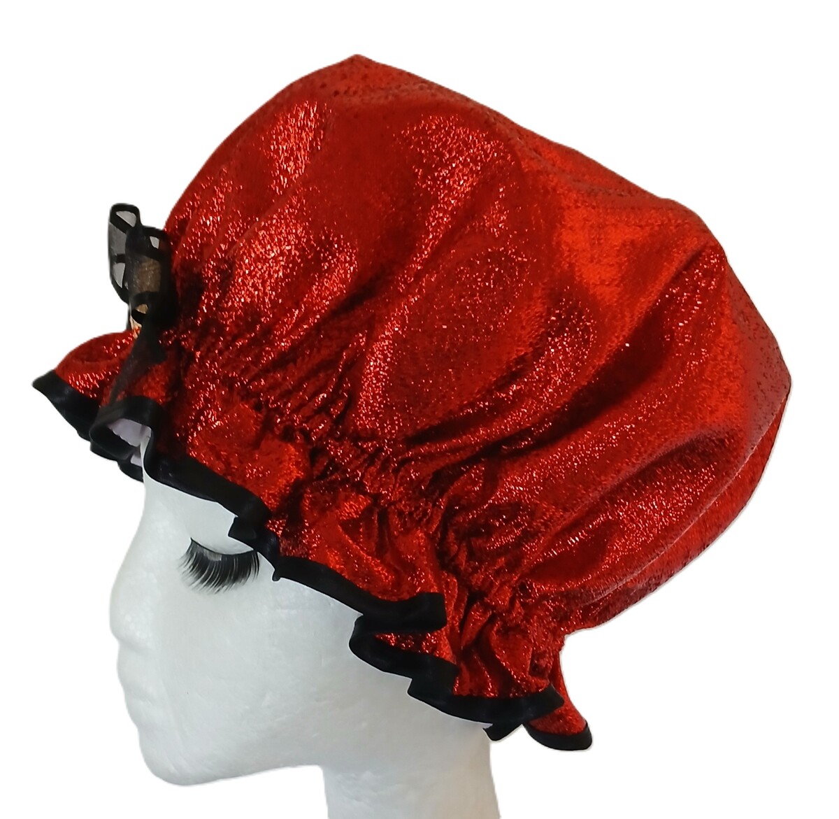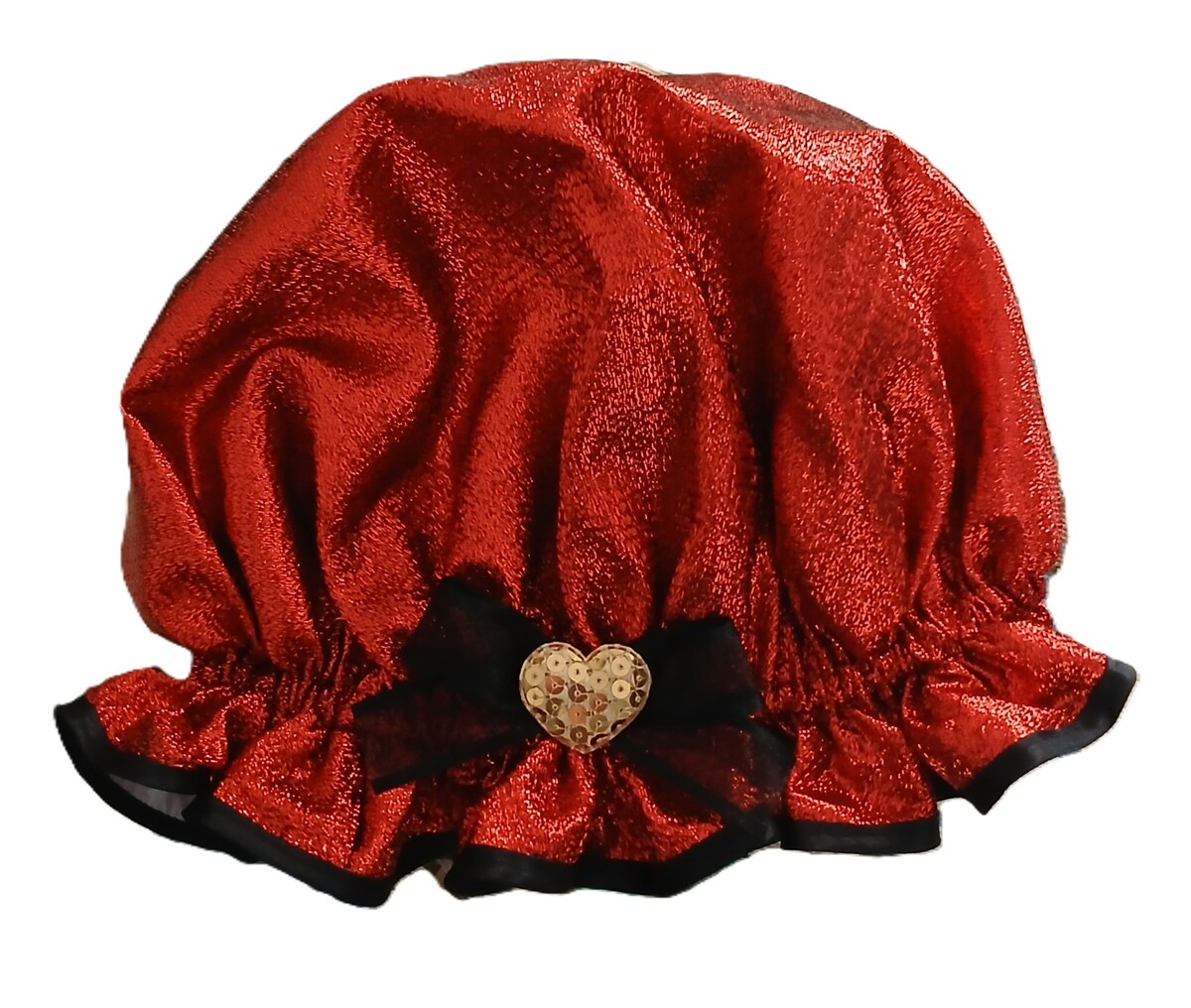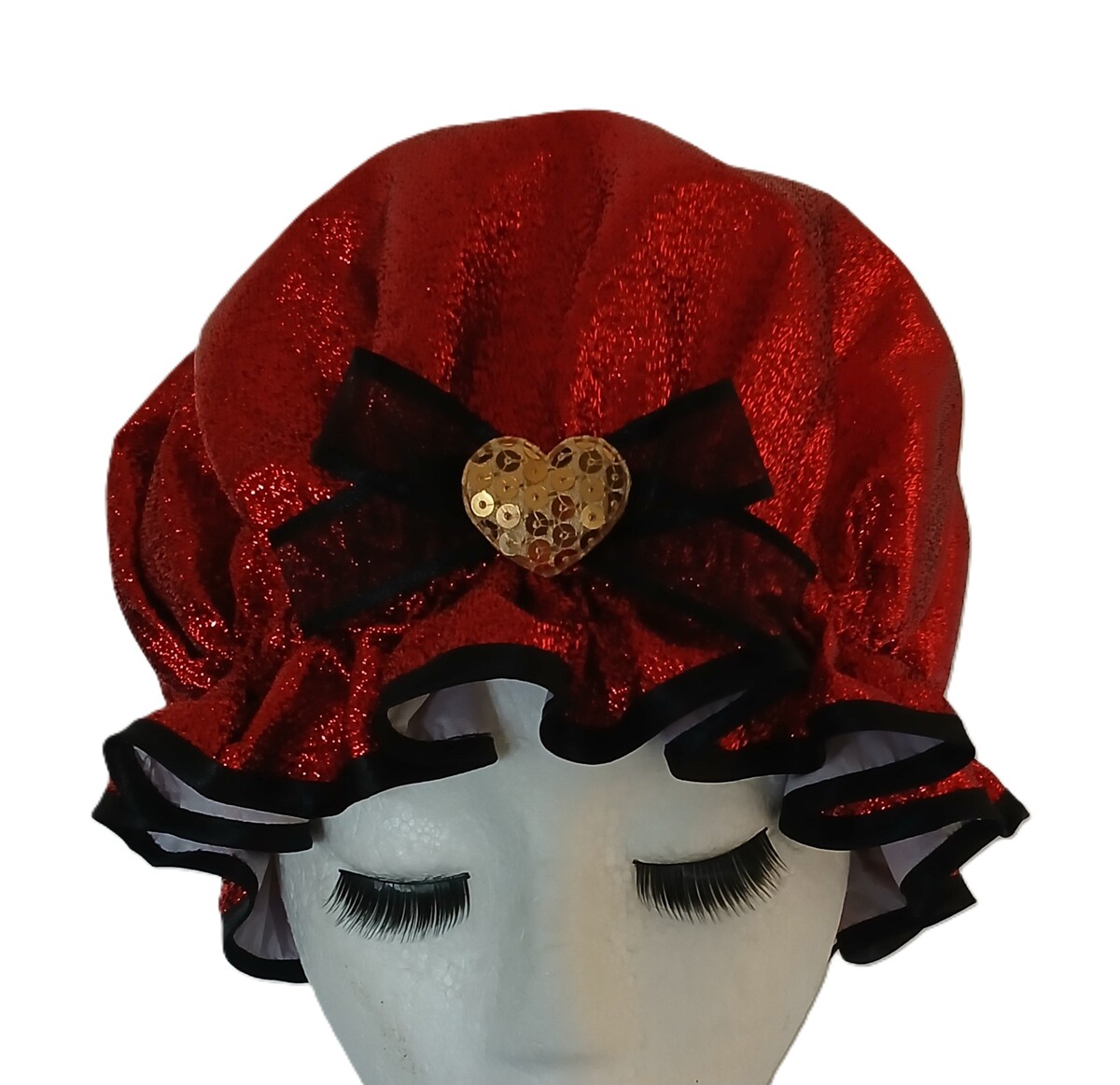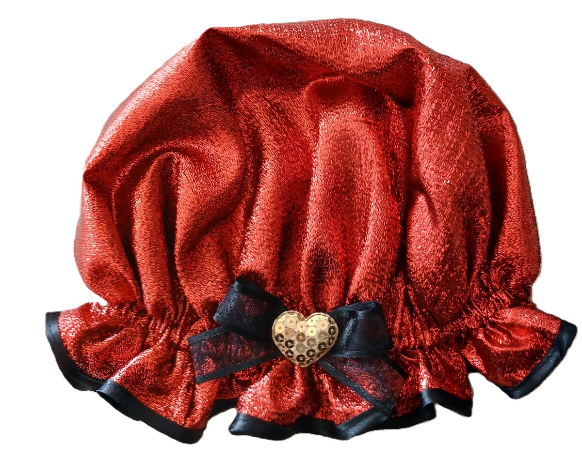 Wear a So Pretty Ritzy Red shower cap if you dare! Red is actually quite a popular colour, and in respect to clothing and accessories, is particularly attributed to being worn as a sign of confidence or to turn heads. Whether it be in the form of a cocktail dress (think Julia Roberts in Pretty Woman), or as a business woman. Dress to impress as they say! So does this shower cap impress or enthuse confidence? I think so! Do you know someone who could wear it with joy? It may well be you I realise. Hence I am sure you will not hesitate to tag a Ritzy Red shower cap whilst they are available. This is a once off fabric so will not be available for the long term. Perhaps this So Pretty Ritzy Red shower cap is a perfect suggestion as a gift for a lady in the Corporate world? Secret Santa, always the fun part of the office Christmas party, and it is a red shower cap which is a Christmas colour by default! This textured Lame fabric is a strong vibrant red, edged with black satin and trimmed with an oversized gold sequinned heart. Red is also deemed as a "sexy" colour, especially in combination with black. Perhaps the Ritzy Red shower cap would be a suitable suggestion as a Valentines Day gift, or gift from him to her on any occasion. Doesn’t have to be a reason for gifting at all really! Is a thoughtful and practical gift idea she will love and appreciate for a long time. Lasts longer than a box of chocolates and doesn’t affect the waistline, isn’t that ideal?