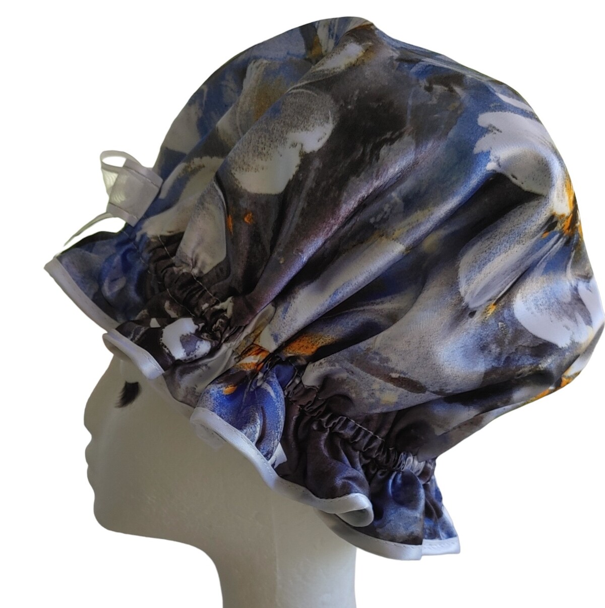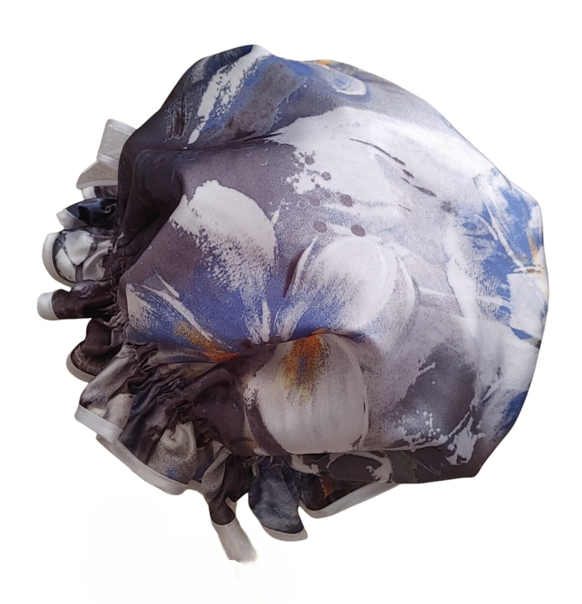 The floral pattern on this design is rather abstract, with Frangipanis appearing randomly over a background of Grey and Blue tones.   Please note the cut of the fabric does vary which means your shower cap may not exactly as shown in the images.  I have several examples here to show you what some variations can be.