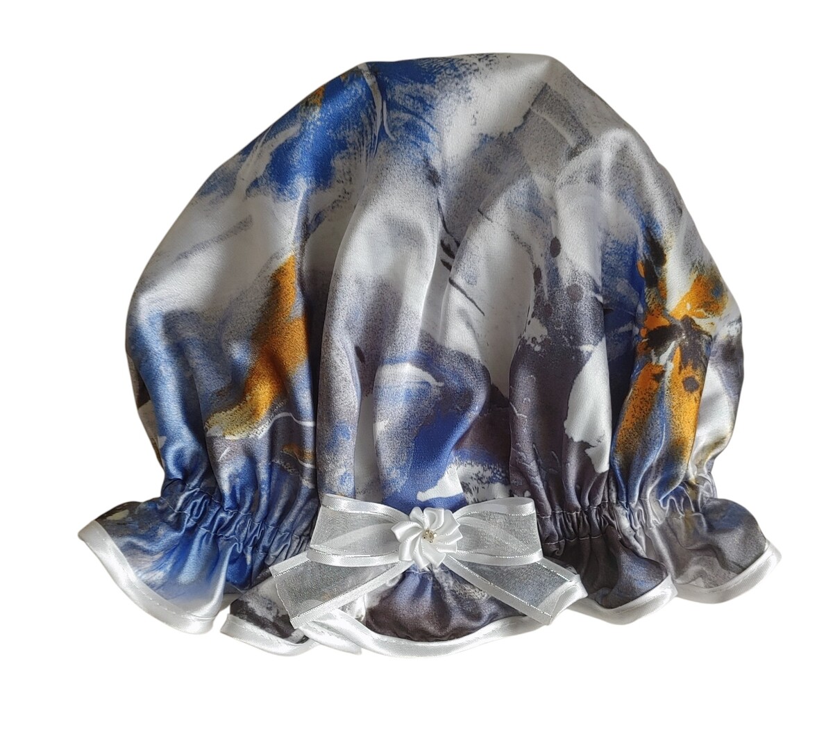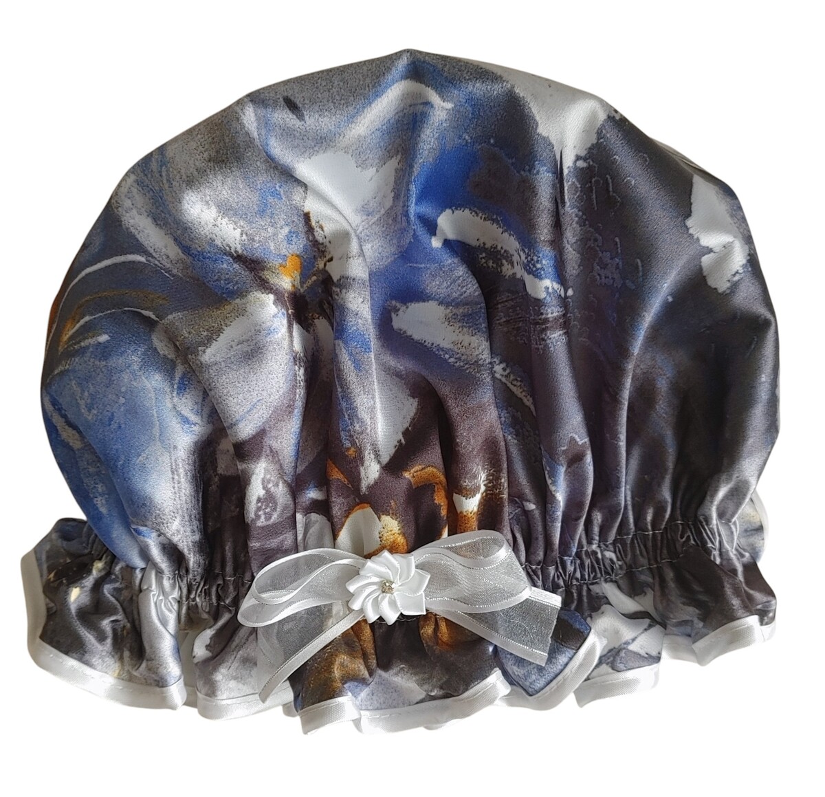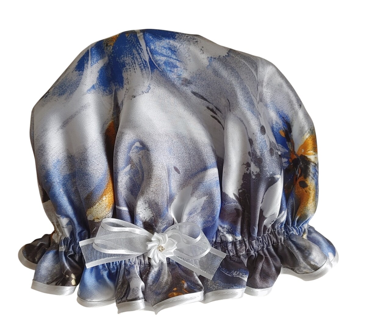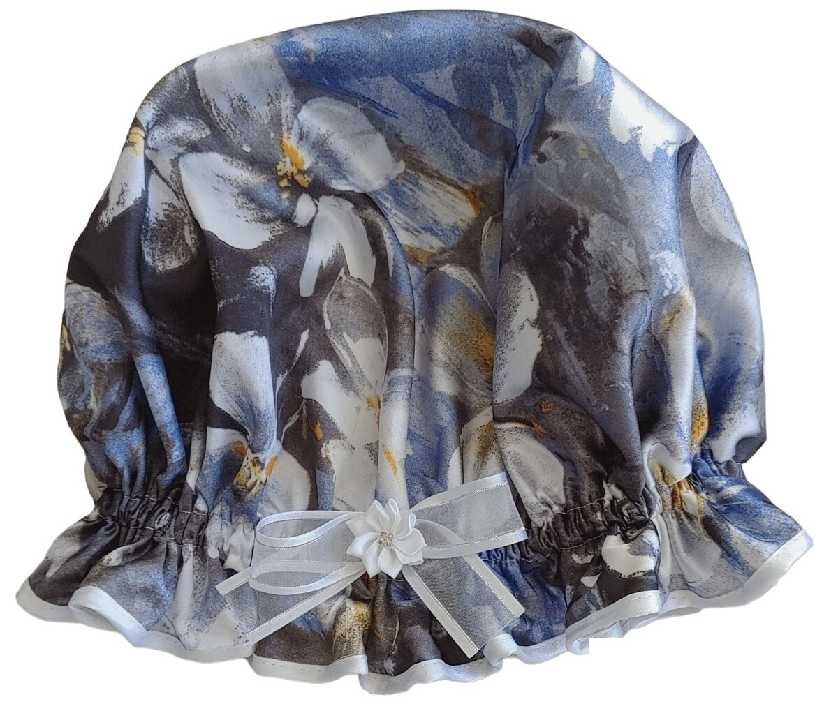 The Frangipanis are centred with a splash of yellow which adds a pop of colour to the Blues and Greys.  As with all So Pretty shower caps, it is generously sized to keep your tresses up and dry at shower time!
