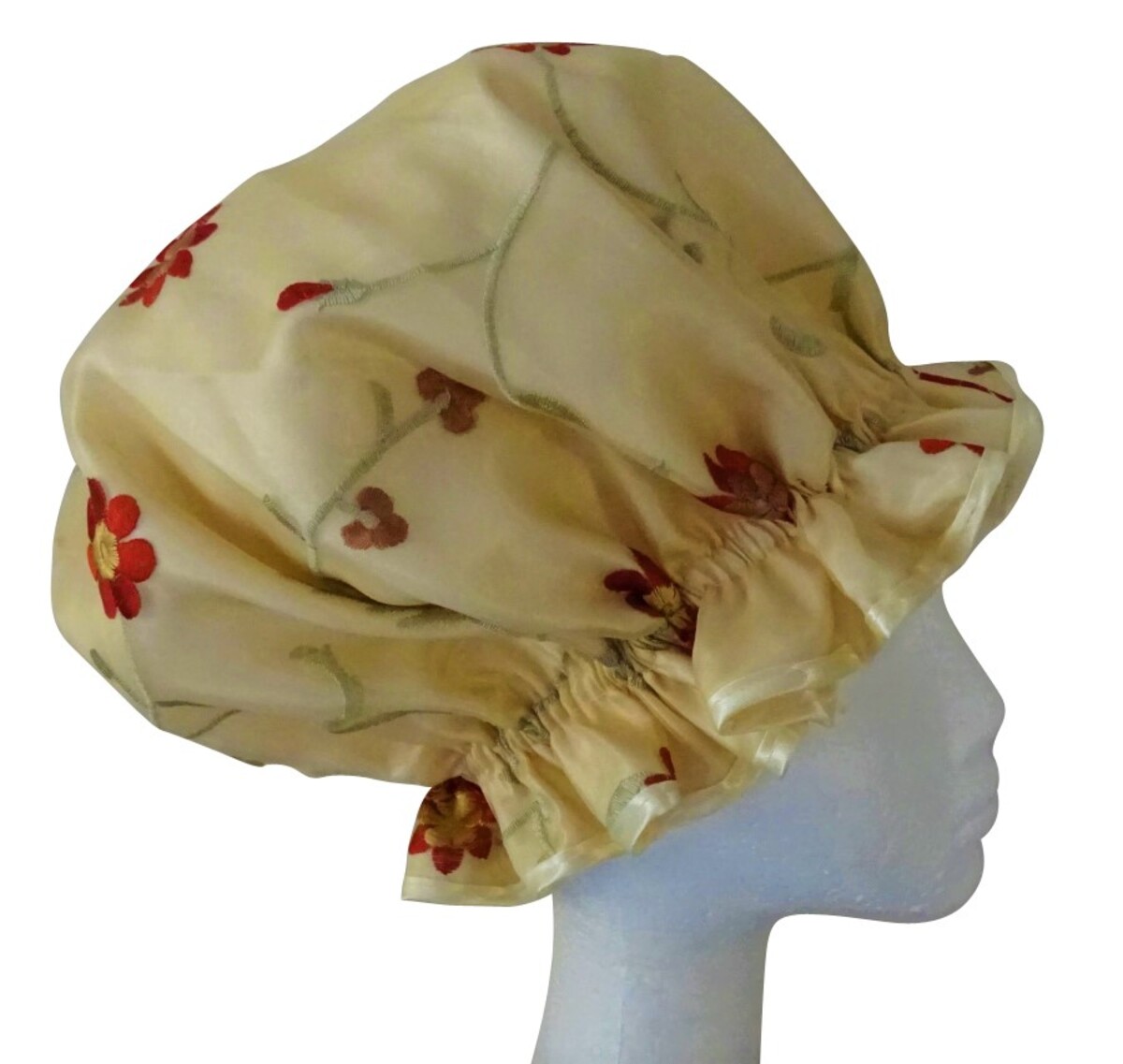So Pretty Sleep Caps are lined with satin, so they are comfortable and nice to your hair. Clementine is an embroidered dark Gold Organza in a very pretty floral design, overlaying an Ivory Cream satin. This Sleep Bonnet is very glam indeed and this is the LAST ONE!