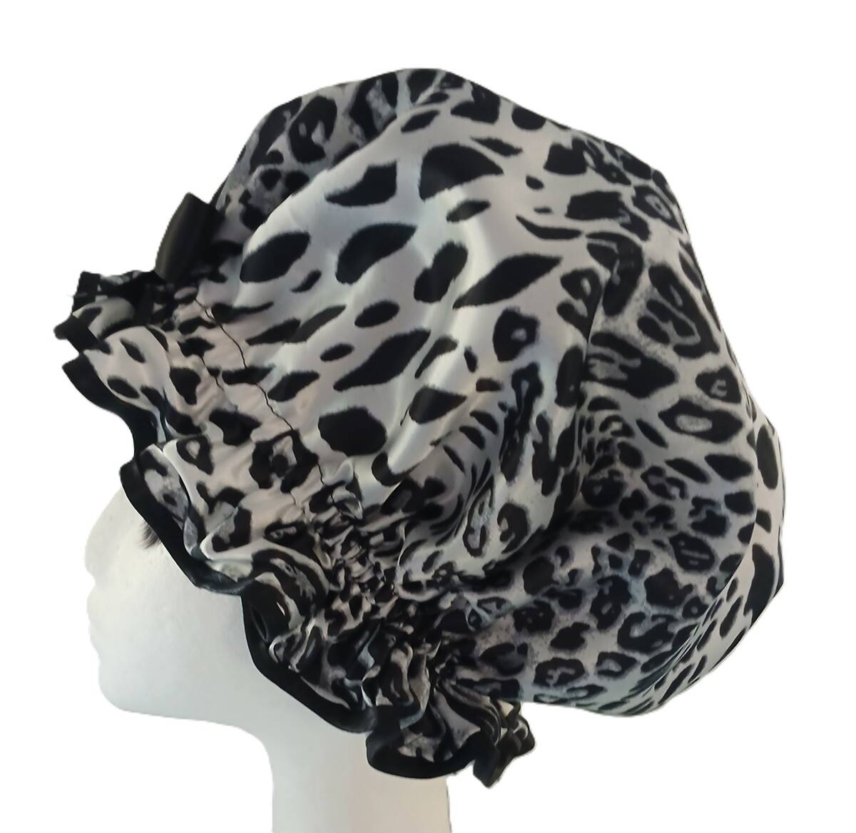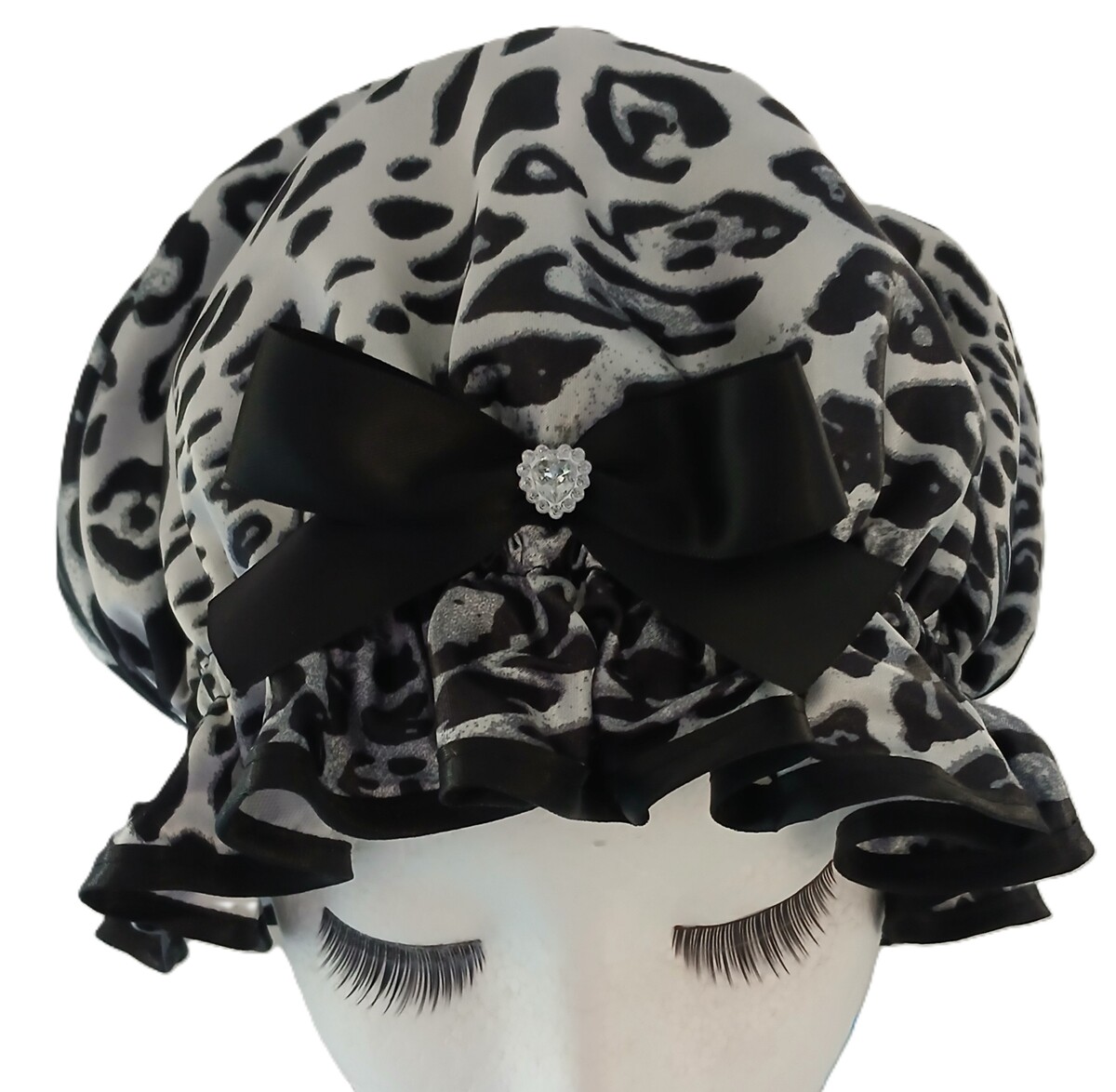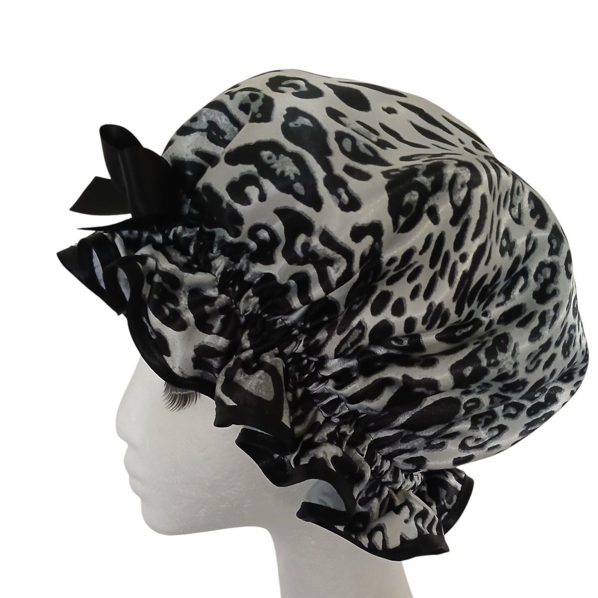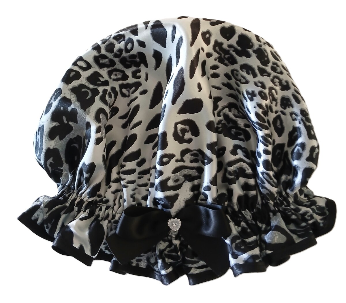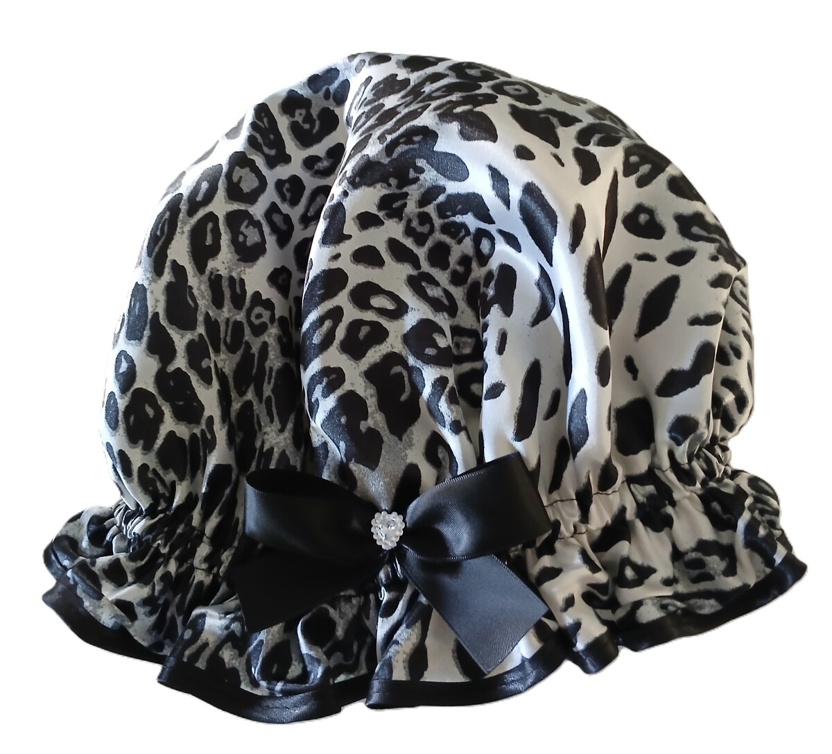 The So Pretty Snow Leopard shower cap is a classic Satin animal print of Black with Grey tones on a white background. Finished off with a sparkling heart shaped Rhinestone centre.