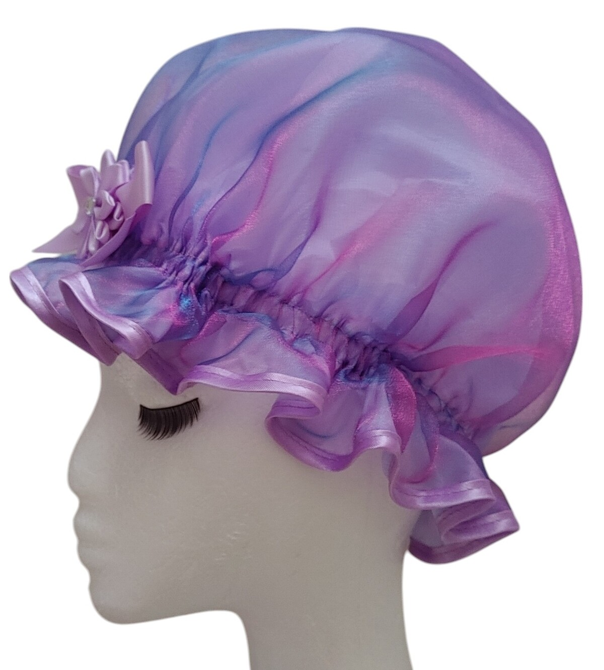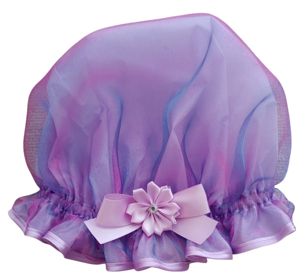 Should you be searching for a shower cap in a shade of Lilac or Lavender, this So Pretty Violetta shower cap could mean the hunt is over! The Violetta is a sheer two toned Organza that shimmers in hues of lilac and blue. Depending on how it catches the light makes the difference of which of these two colours is the strongest visually, but overall the Lilac dominates.