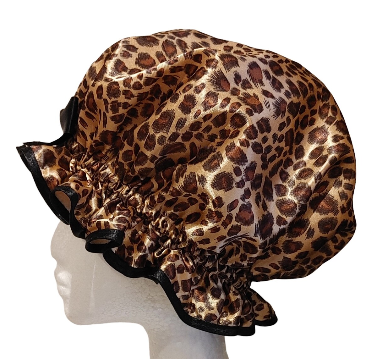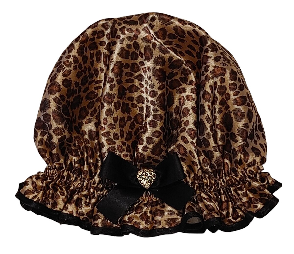 This So Pretty Wild Cat shower cap is a Poly Satin print fabric trimmed with satin edging and centred with a metallic gold heart. Lined with a durable yet soft plastic to make it waterproof and protect your tresses! The standard Ladies size here is bouffant style that will easily enclose hair that is as long as mid back and is also suitable for dreadlocks. . Leopard print has never ceased in popularity, regularly making an appearance year after year in some shape or form. Whether used as fashion clothing, shoes or accessories, leopard print creates that modern look that stands the test of time! This So Pretty Shower Cap is no exception! The Wild Cat shower cap has been a staple with So Pretty since 2002 so that says something. African animal prints have never dulled in popularity. Perhaps it goes way back to prehistoric days when man used animal skins to clothe themselves, who knows! Nature produces gorgeous patterns and colours, thankfully we are clever enough to replicate them through processes of printing and dyeing rather than using the real thing. So enjoy your Wild Cat leopard print shower cap by So Pretty, it just may be the closest you get to having an encounter with one of these beasts (unless your husband walks in on you whilst you are in the shower…I am sure the claws would come out then!) Also available as an XL shower cap, matching Mens shower cap. Sleep Mask and as a Sleep Cap.