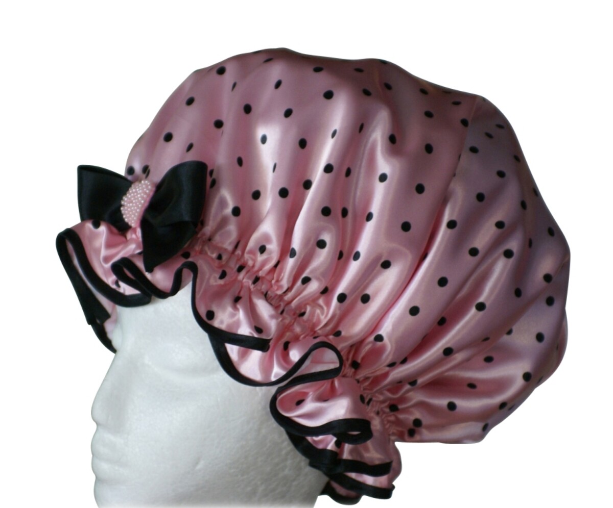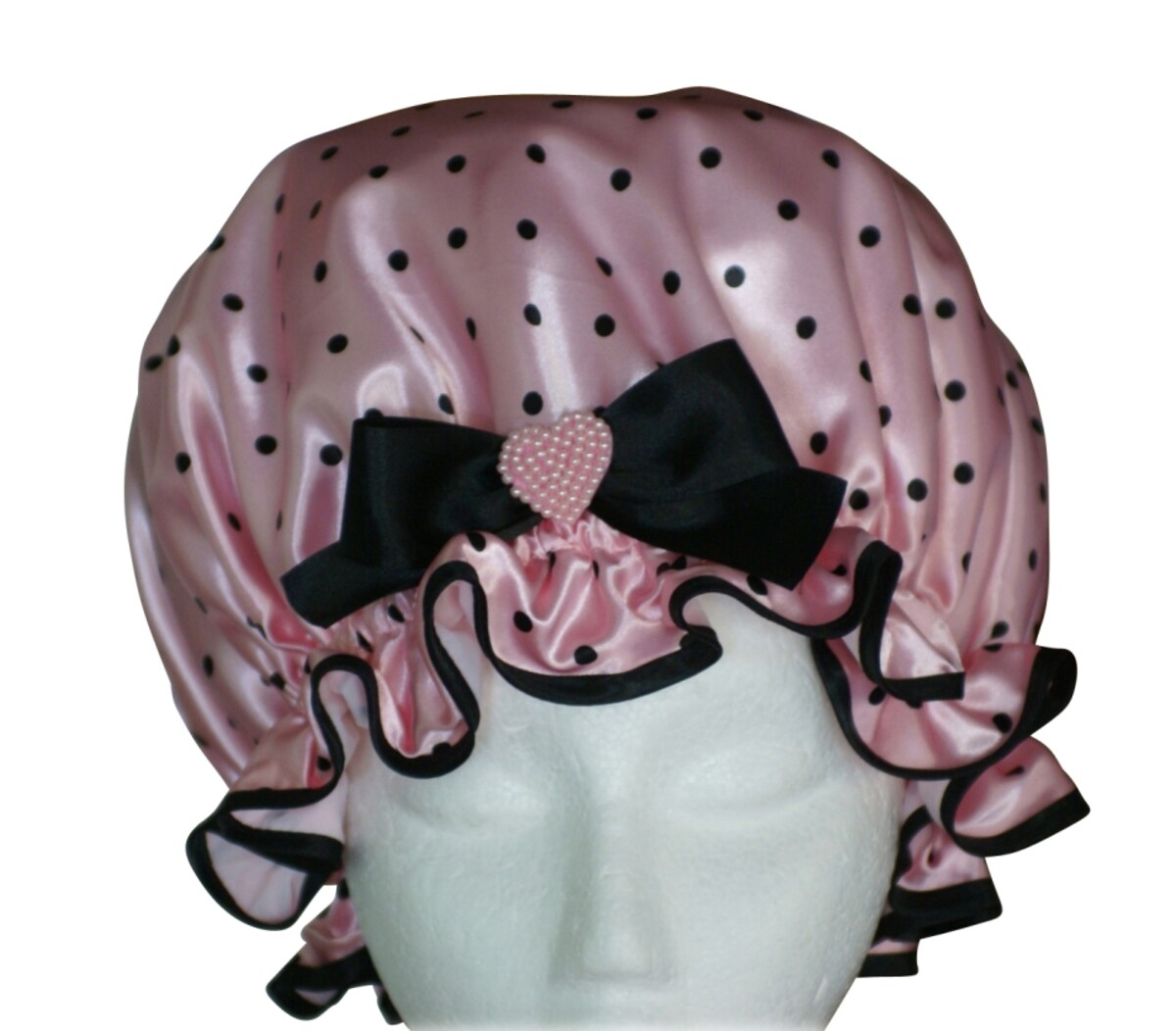 Dottie by So Pretty Shower Caps has been the iconic shower cap of the collection since So Pretty commenced in 2002. The XL version wasn’t too far behind as it was not long before the bouffant and oversized design of the So Pretty Ladies shower cap was still not enough for some ladies! The So Pretty Shower Caps XL size is recommended for extremely long (eg lower back) / unusually thick hair, or to accommodate dreadlocks to middle back. The Dottie is a Satin polka dot print, this XL version has a larger Black Satin bow but the same Pink beaded heart as the standard Ladies version. Must be reassuring to know that if you love the Dottie shower cap, and your hair grows super long, that you can upgrade to an XL Dottie without distress! Polka Dots have been a part of fashion for generations and seemingly will never fade away. The pattern is found on just about anything you can think of really, especially more so amongst fashion and accessories. Polka Dot satins like the one used here with the So Pretty Dottie shower cap, are often used for matching Pyjamas and Summer dressing gown sets, or Mens boxer shorts. It is an excellent lightweight fabric that does not crush, does not need ironing, washes and dries well. These are the main criteria So Pretty looks for when hunting down suitable fabrics for the shower cap range. The hunt is always on for beautiful fabrics from around the world! The end result is what you see here with the fabulous range at So Pretty Shower Caps!