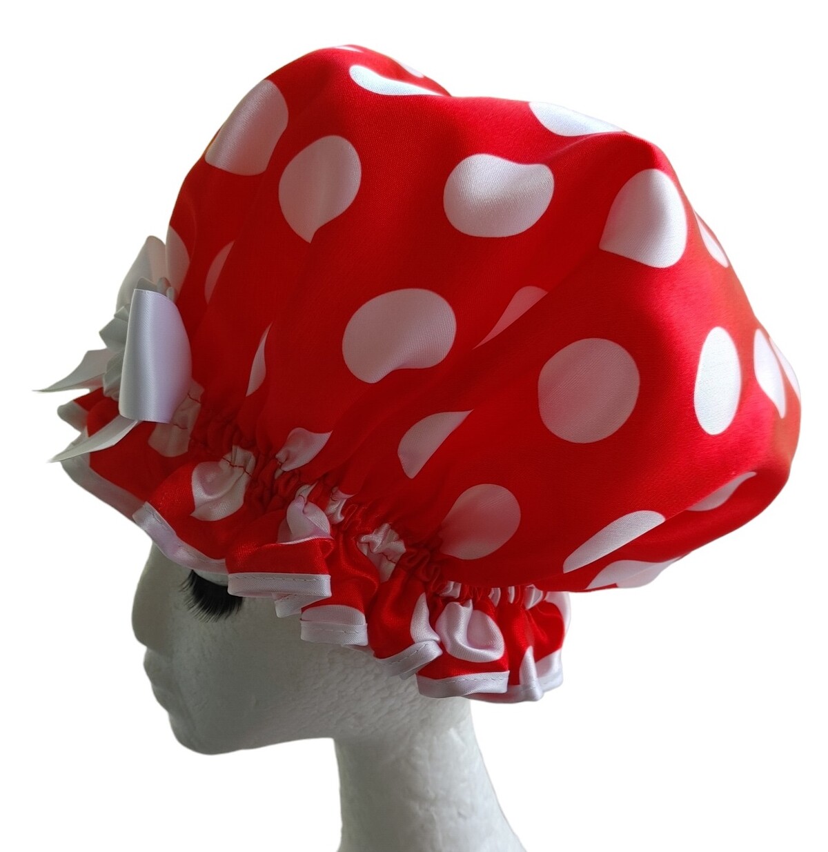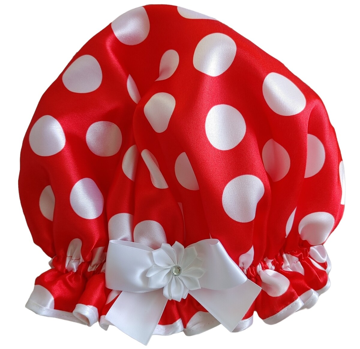This So Pretty XL Minnie Shower Cap has the WOW factor for sure! Bright and bold for those big fans of polka dots and Minnie Mouse of course! Red Satin with larger than usual White Polka dots which suits the XL design (and a big personality maybe?!!). Along with the XL shower cap sizing comes a variation of the embellishment and trim to the standard Ladies Minnie shower cap. XL Minnie has a wider Satin ribbon bow and a large and classy white Satin flower centred with a glass bead. This is a shower cap that will be quite the statement in your bathroom décor, or even just casually wandering around the house, there are no limits here! Actually So Pretty shower caps can have multi purpose uses, they are brilliant for when you apply a face mask and need to keep your hair out of the way. Even whilst applying makeup is a similar situation. Else if you have had your lovely long tresses straightened or simply don’t want a case of the frizz going on, protecting your hair using a So Pretty Shower Cap will be the way to go! So Pretty Shower Caps have been known to be used whilst attending water aerobics classes, which is a hoot. As long as you keep your head out of the water it will be useful but it is not a bathing cap! Even relaxing in a Spa, a So Pretty Shower Cap is a handy hair accessory to keep your tresses under control!