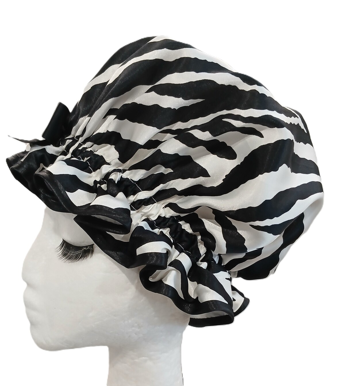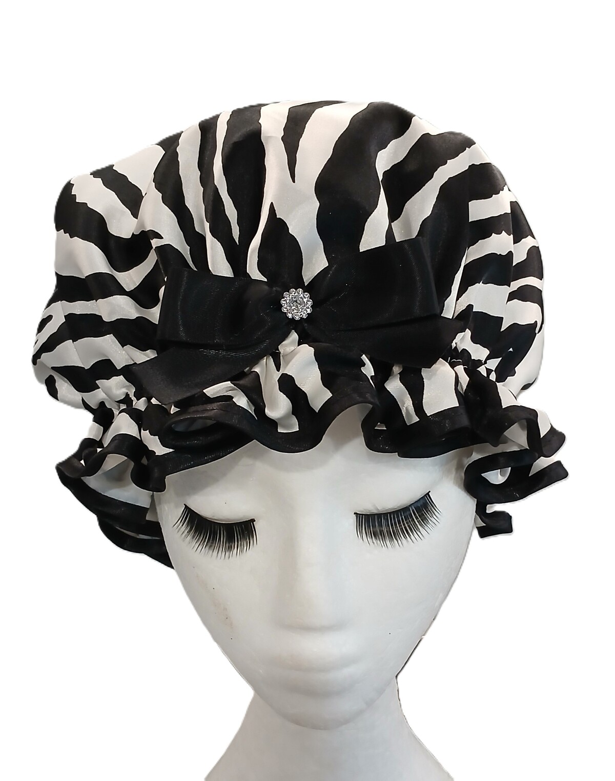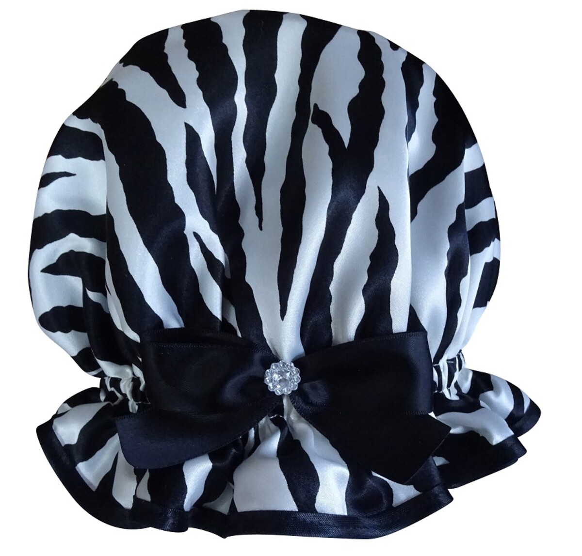 So Pretty Zebra Shower Cap is a classic animal print in black and white satin. Black and White as a combination or even individual is always popular whether it be for clothing or accessories like these. This So Pretty Shower Cap ticks a lot of boxes for being functional as well as an attractive bathroom décor accessory! The cute diamante flower on the ribbon bow adds a touch of glamour and sparkle as well. The So Pretty Zebra Shower Cap would be an ideal gift for someone who intends to travel, especially if it is to Africa! Alternatively for someone who has been there, done that. Even more fun as a group gift if travelling with friends as there are several animal print shower caps by So Pretty that could become a themed gift for the group. As a travel accessory, a So Pretty Shower Cap is a must have and very useful. They are quick drying, weigh next to nothing and don’t take up much space in your luggage. So Pretty shower caps are far more pleasant to use than putting up with the flimsy hotel giveaways (they are best suited for salad bowl covers if you ask me!). Just don’t leave your beautiful shower cap behind in your travels! Another suitable recipient for a So Pretty Zebra shower cap would be someone who loves horses, hopefully they love Zebras just as much!. (This design is also available as a Mens shower cap which is a "no frills" design that some Ladies prefer as well)